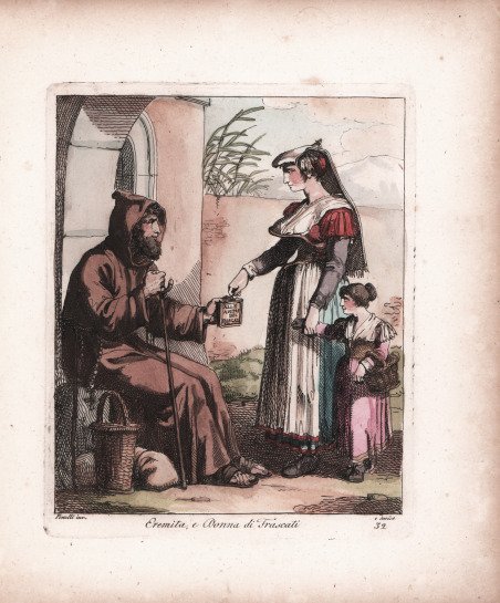 Costume popolare tratto dalla ' Nuova Raccolta di cinquanta motivi pittoreschi e costumi di Roma, 1810. Rara e bella serie, la seconda prodotta dall'artista, raffigurante costumi popolari singoli e in gruppo, scene e mestieri non solo di Roma e dintorni, ma anche di Campania, Calabria e Abruzzi. Stampatore, pittore, scultore e disegnatore italiano. Apprese i rudimenti della scultura dal padre, artigiano di piccole statuette religiose di scarso valore. Questo apprendistato in tenera età incoraggiò Pinelli ad enfatizzare la plasticità e l’espressione rispetto ai valori del Neo-Classicismo, predominanti a Roma. Purtroppo, sono pervenute fino a noi solo pochi esemplari delle sue sculture in terracotta, mentre conosciamo il volume di acqueforti, Gruppi pittoreschi (Roma, 1834), con rappresentazioni di popolani. L’enfasi sul naturalismo e su soggetti di vita quotidiana è di nuovo evidente. Sebbene avesse studiato presso l’Accademia di Belle Arti a Bologna, sostenuto economicamente dal Conte Lambertini, il nipote di Papa Benedetto XIV, Pinelli non aveva interesse a seguire l'iter tradizionale del successo artistico attraverso i soggetti religiosi. Di ritorno a Roma, alla fine del XVIII secolo, decise di vendere le sue opere nei caffè frequentati dai turisti. Incisione in rame, finemente colorata a mano, in ottimo stato di conservazione. Popular costume from ' Nuova Raccolta di cinquanta motivi pittoreschi e costumi di Roma, 1810. Rare and beautiful series, the second produced by the artist, depicting individual and group popular costumes, scenes and crafts not only of Rome and its surroundings, but also of Campania, Calabria and Abruzzi. Italian printmaker, painter, sculptor and draughtsman. He learnt the rudiments of sculpture from his father, a maker of cheap religious statuettes. This early training encouraged Pinelli to emphasize plasticity and expression over the Neo-classical values prevalent in Rome. Although only a few of his terracotta figures survive however, he did produce a volume of etchings, Gruppi pittoreschi (Rome, 1834), depicting rustic groups. Its emphasis on naturalism and everyday subject-matter is also characteristic of his sculptures. Although he studied both at the Accademia di San Luca in Rome and at the Accademia di Belle Arti in Bologna, helped financially by Conte Lambertini, Pope Benedict XIV’s nephew, Pinelli was not interested in pursuing the traditional path to artistic success via religious or history painting. On returning to Rome in the late 1790s he chose to peddle his works at the cafés frequented by tourists. Copperplate, finely hand coloured, in excellent condition. Cfr.