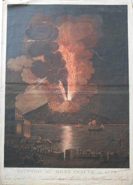 Paris, 1780 circa. Incisione in rame all’acquatinta, cm 49,8 x 65,8 (la parte incisa) più margini. Alexandre D’anna pinx. – J.Bte Chapuy sculp. (nel margine bianco e in basso, in scuro, nella parte raffigurata). Bellissima la veduta animata in notturna col Vesuvio in eruzione in questa stampa di notevole rarità e importanza. Due pieghe trasversali nella parte centrale e difetti ai margini , discreto stato di conservazione.