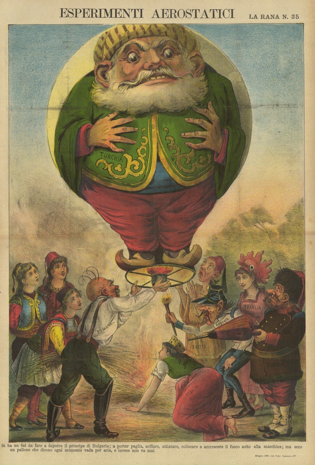 Litografia, antica ed originale, stampata a colori, tratta dal ricercato e raro giornale umoristico settimanale LA RANA, fondato e pubblicato a Bologna nel novembre 1865 da Leonida Gioannetti e da Augusto Grossi. Fu un giornale di grande successo per le sue satiriche caricature a colori di cui alcune in qudruplo foglio che fu uno dei successi editoriali. I politici, lo Stato Ecclesiastico e la politica europea furono i prediletti ispiratori. Il periodico affrontò una grave crisi nel 1873, quando Grossi decise di abbandonare la redazione per fondare Il Papagallo. La Rana sospese le pubblicazioni nel 1911, per cessarle definitivamente nel 1912. Numero 35 pubblicato venerdi 27 agosto 1886. "Si ha un bel da fare a deporre il principe di Bulgaria; a portar paglia, soffiare, attizzare, collocare e accrescere il fuoco sotto alla macchina; ma ecco un pallone che dicono ogni momento vada per aria, e invece non va mai."