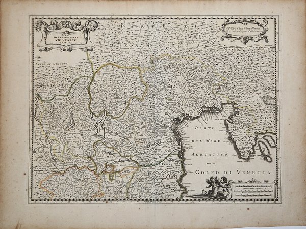 La carta del Dominio Veneto stampata da Pierre Mariette deriva dalla produzione cartografica di Nicolas Sanson, con il quale Pierre Mariette "il vecchio" e suo figlio Pierre "il giovane" (1634-1716) collaborarono per la stesura del celebre "Cartes Genèrales de toutes les parties du Monde". Alcune carte, edite in un secondo momento, come la presente, direttamente da Mariette, vengono ricavate da modelli diversi; in questo caso è evidente la derivazione maginiana, anche se sicuramente Mariette l’ha piuttosto ricavata dagli atlanti olandesi, data la sua collaborazione con gli editori di Amsterdam, in particolare con Blaeu e Janssonius.Incisione in rame, coloritura coeva dei contorni, in perfette condizioni. Rara. This map of Domio Veneto printed by Pierre Mariette comes from the cartographic production of Nicolas Sanson, with which Pierre Mariette "the old" and his son Pierre "the young" (1634-1716) collaborated for the writing of the famous "Cartes Genèrales de toutes les parties du Monde ".Copper engraving in perfect condition. Rare. Cfr. Tooley, Dictionary, p. 206.