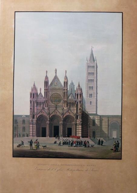 Dal celebre "Chiese principali d'Europa" edito a Milano da Artaria nel 1824, e successivamente ristampato nel 1829 dalla Tipografia Destefanis. Incisione in rame all’acquatinta, colore d’epoca, cm 37 x 52,5 circa (alla lastra) più margini. La veduta esterna è disegnata dal vero da C. Gilio e incisa da L. Rupp. Esemplare ingiallito ai margini ma in bella e vivace coloritura, molto buono lo stato di conservazione. .