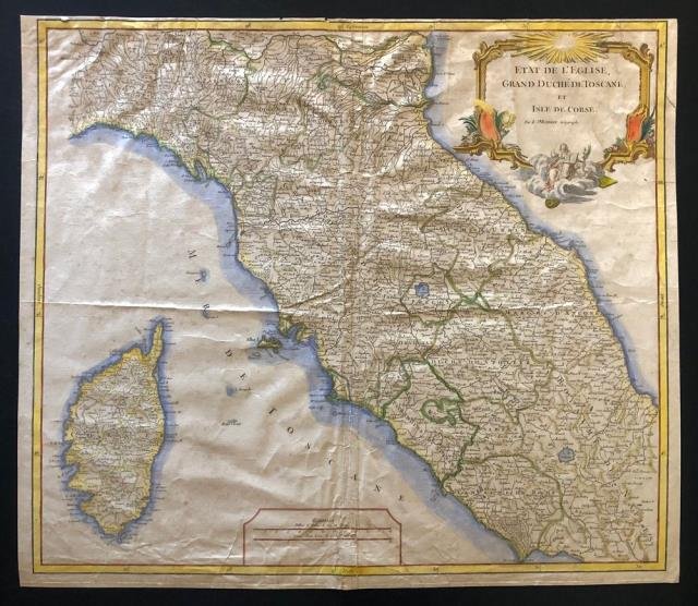 Incisione in rame all'acquaforte, 1750 circa, vecchia ma non originale coloritura, cm 49,5 x 57,5 (il foglio). Grande carta geografica dello Stato della Chiesa e del Granducato di Toscana con l'Isola di Corsica, preparata in origine da Nicolas Sanson ed edita, in questo secondo stato, da Gilles Berto De Vaugondy (vedi il nome nel titolo “SR Robert”). Nicolas Sanson (Abbeville, 1600 - Parigi, 1667) è considerato il fondatore della cartografia francese e lavorò al servizio della corte di Francia. Questa carta dello Stato della Chiesa e del Granducato di Toscana fu in origine inserita nel suo atlante “Cartes générales de toutes les parties du Monde”, stampato per la prima volta nel 1654, con una lastra che riprendeva i documenti del Magini di mezzo secolo prima. Gilles Robert de Vaugondy, noto anche come Le Sieur o Monsieur Robert (Parigi, 1688 - Parigi, 1766) e suo figlio, Didier Robert de Vaugondy, furono importanti cartografi nella Francia del diciottesimo secolo. Ai primi del settecento il rame giunse per l'appunto a disposizione di Gilles Robert de Vaugondy il quale inserì la mappa nel proprio “Atlas Universal” del 1750 e apportò alcune variazioni, tra cui la più evidente resta la sostituzione con il proprio nome nel titolo. Questa grande carta geografica dell'Italia centrale si caratterizza per sobrietà e precisione ed è apprezzata come una tra le migliori cartografie del periodo: evidenti sono i confini tra i vari stati e quelli interni dei territori, ricche di chiara lettura sono la toponomastica e l'idrografia. Il cartiglio in alto a destra decora la carta ma presenta una struttura incompleta rispetto ad altri esemplari giacché manca la colomba in mezzo ai raggi in alto, gli stemmi dello Stato della Chiesa e dei Medici sono qui vuoti, l'ostensorio non risulta terminato e mancano la croce e la pisside dalle mani della Madonna. Esemplare non proprio fresco con gualciture e imperfezioni della carta e con brevi rinforzi al verso del foglio; nell'insieme in piacevole coloritura e in accettabile stato di conservazione.