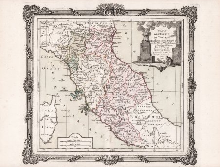 Carta geografica tratta dall'opera Atlas Général, civil, ecclesiastique et militaire métodique et élémentaire pour l'étude de la géographie et de l'histoire. Paris, chez Desnos, 1768. Ristampe anche nel 1776, 1786 e ' 1791. “La graduazione ai margini, di 10' in 10', va da 41° 10' a 45° 12' ca. lat. e da 26° 45' a 33° 12' ca. long. È orientata sui quattro lati e ha scale in leghe orarie e miglia italiane. Di un certo pregio è il cartiglio a cornice del titolo, raffigurante un uomo inginocchiato dinanzi a un'ara romana sopra la quale arde un fuoco. L'incisione del Desnos rappresenta gli stati della Chiesa, della Toscana e di Modena e Lucca. Il profilo geografico del tratto di peni- sola raffigurato è piuttosto snello e semplificato nelle frastagliature costiere, rivelandosi così di impostazione pienamente settecentesca. Nonostante le dimensioni piuttosto ridotte, la tavola si segnala per una certa ricchezza di contenuti geografici. Sono indicati i confini politici e, con linea puntinata, le partizioni territoriali dei singoli stati. La rappresentazione dell'orografia è limitata alla dorsale appenninica principale, mentre maggiore dettaglio è riservato ai corsi d'acqua e ai bacini lacustri (si notino quelli della conca reatina e in particolare il lago di Piediluco). Il simbolo dei centri abitati sede di diocesi è sormontato da una croce. Il termine Umbria sostituisce la denominazione di Ducato di Spoleto. La nomenclatura è in francese” (cfr. "Le antiche terre del Ducato di Spoleto", p. 190). Acquaforte, con coloritura coeva, in ottime condizioni. Carta geografica tratta dall'opera ' Atlas Général, civil, ecclesiastique et militaire métodique et élémentaire pour l'étude de la géographie et de l'histoire. Paris, chez Desnos, 1768. Ristampe anche nel 1776, 1786 e ' ' 1791. “La graduazione ai margini, di 10' in 10', va da 41° 10' a 45° 12' ca. lat. e da 26° 45' a 33° 12' ca. long. È orientata sui quattro lati e ha scale in leghe orarie e miglia italiane. Di un certo pregio è il cartiglio a cornice del titolo, raffigurante un uomo inginocchiato dinanzi a un'ara romana sopra la quale arde un fuoco. L'incisione del Desnos rappresenta gli stati della Chiesa, della Toscana e di Modena e Lucca. Il profilo geografico del tratto di peni- sola raffigurato è piuttosto snello e semplificato nelle frastagliature costiere, rivelandosi così di impostazione pienamente settecentesca. Nonostante le dimensioni piuttosto ridotte, la tavola si segnala per una certa ricchezza di contenuti geografici. Sono indicati i confini politici e, con linea puntinata, le partizioni territoriali dei singoli stati. La rappresentazione dell'orografia è limitata alla dorsale appenninica principale, mentre maggiore dettaglio è riservato ai corsi d'acqua e ai bacini lacustri (si notino quelli della conca reatina e in particolare il lago di Piediluco). Il simbolo dei centri abitati sede di diocesi è sormontato da una croce. Il termine Umbria sostituisce la denominazione di Ducato di Spoleto. La nomenclatura è in francese” (cfr. "Le antiche terre del Ducato di Spoleto", p. 190). Acquaforte, con coloritura coeva, in ottime condizioni. Cfr. F. Ronca e A. Sorbini (a cura di) "Le antiche terre del Ducato di Spoleto", p. 190, n. 81.