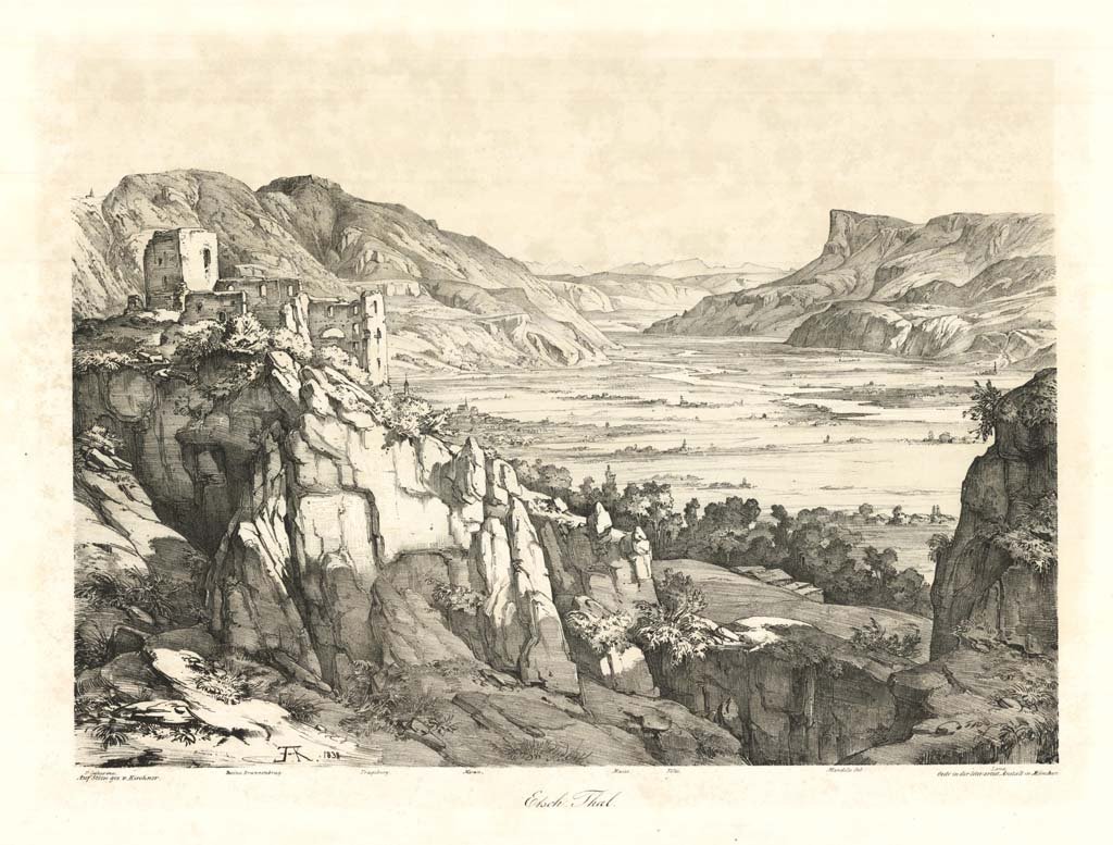Bella veduta della valle di Merano stampata in seppia inserita nell'opera “Ansichten von Tyrol und Salzburg”