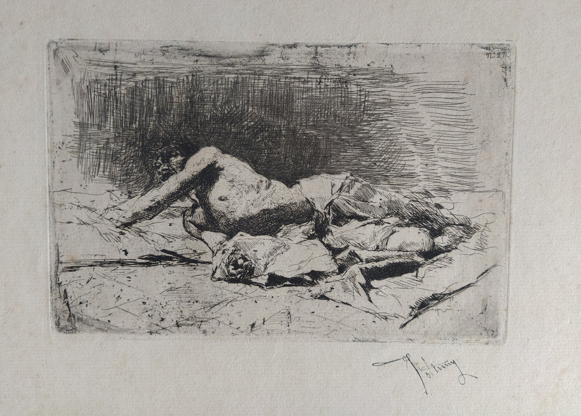 Impressione eccellente dal tratto deciso, su carta vergellata avorio. Esemplare appartenente alla seconda tiratura (1878) senza titolo ma con numero e timbro riproducente la firma dell'artista in basso a destra. Ottimo stato di conservazione. Ampi margini oltre la battuta del rame.