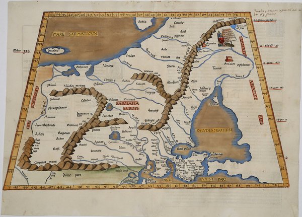 Carta tolemaica dell'antica regione della Sarmazia corrispondente all'attuale territorio di Ucraina e Russia. Questa regione era conosciuta in epoca romana come ' Sarmatia Europae ' e rappresentava il limite della conoscenza accurata della geografia del mondo romano verso nord-est. La mappa è particolarmente dettagliata nelle aree lungo la costa del Mar Nero, comprese l'Ucraina e la Crimea. Tuttavia, il Mare d'Azov (allora noto come Lago Maeotiano) è fortemente distorto e tutti i punti a est sembrano essere dovuti più a voci che a contatti reali. La mappa è basata sulla mappa di Waldseemuller, pubblicata per la prima volta nella ' Geographia ' di Strasburgo del 1513. La prima edizione della "Geographia" di Tolomeo curata da Fries fu pubblicata a Strasburgo nel 1522, con le carte che furono copiate e nuovamente incise da quelle di Martin Waldseemüller dell'edizione di Tolomeo del 1520 e testo a cura di Pirckheimer. Nel 1525 viene stampata una seconda edizione a Strasburgo. Alla scomparsa del Fries e del Gruninger, le matrici furono acquistate dai fratelli Melchior e Gaspar Treschel che ne stampano una terza edizione a Lione nel 1535. Per il testo i due editori si servirono della supervisione di Michael Servetus, che curò la revisione del testo del Pirckheimer. Infine, nel 1541, Gaspare Treechsel pubblica a Vienne, nel Delfinato, questa quarta edizione, sempre con testo di Servetus. In questa edizione, rispetto alla prima di Strasburgo del 1522, il testo subì numerose modifiche, correzioni e aggiunte, ma i legni non furono modificati. Esemplare tratto dall’edizione del 1541, del "Claudii Ptolemaei Alexandrini Geographicae Enarrationis". Xilografia, finemente colorata a mano, in ottimo stato di conservazione. Ptolemaic map of ancient Sarmatia the region between the Baltic, Adriatic and Black Seas. ' This region was known in the Roman period as Sarmatia Europae, and it represented the limit of the Roman world’s accurate knowledge of geography to the northeast. The map is particularly detailed in those areas along the Black Sea coast, including the Ukraine and the Crimea. However, the Sea of Azov (then known as the Maeotian Lake) is greatly distorted, and all points east appear to owe more to rumor than to actual contact. Nice example of the 1541 edition of Lorenz Fries ' map, based upon Waldseemuller's map, first published in 1513. The first edition of Ptolemy's ' Geographia ' edited by Fries was published in Strasbourg in 1522, with maps that were copied and re-engraved from those of Martin Waldseemüller of the 1520 edition of Ptolemy and text edited by Pirckheimer. In 1525 a second edition was printed in Strasbourg. At the death of Fries and Gruninger, the plates were purchased by the brothers Melchior and Gaspar Treschel, who printed a third edition in Lyon in 1535. For the text, the two editors used the supervision of Michael Servetus, who edited Pirckheimer's text. Finally, in 1541, Gaspare Treechsel published in Vienne, in the Dauphiné, this fourth edition, again with Servetus' text. In this edition, compared to the first edition of Strasbourg in 1522, the text underwent numerous changes, corrections and additions, but the wood-blocks were not changed. ' Woodcut, finely colored by hand, in excellent condition. Cfr.