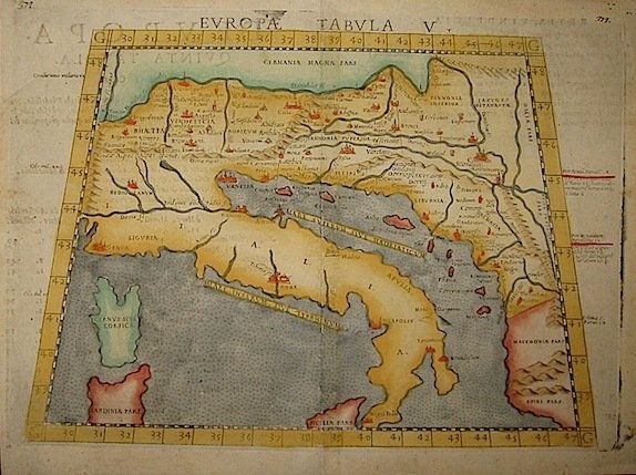 Incisione originale su rame (cm. 26x19 più margini) tratta da ‘La Geografia di Claudio Tolomeo’. Bella coloritura all’acquarello. Ottimo esemplare.