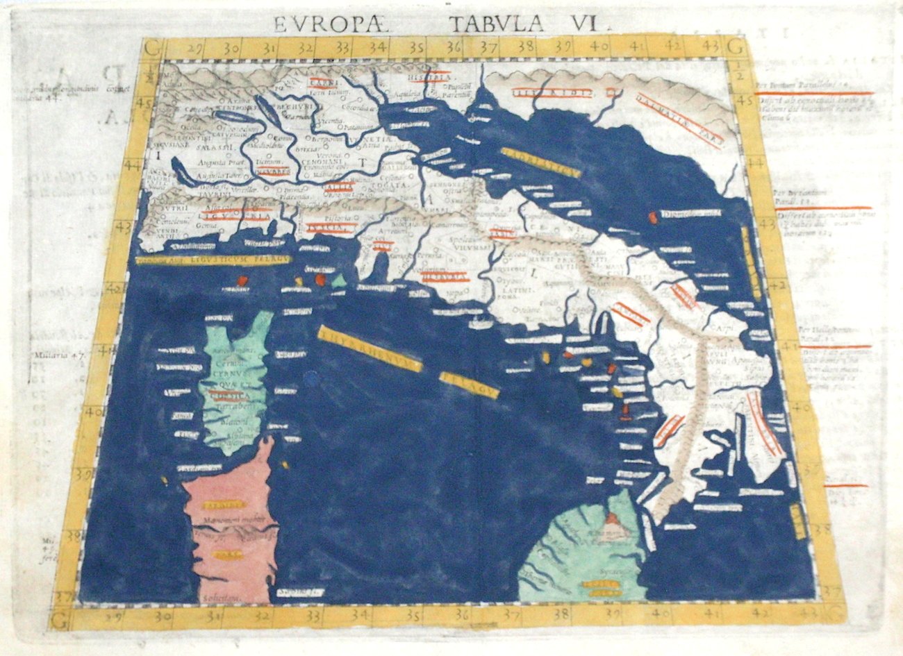 Incisione in rame, colorata a mano, di mm 190x263, tratta dall'edizione veneziana della "Geographia" curata da Ruscelli. Raffigura la penisola italiana. Buon esemplare, con due piccoli fori nella parte superiore della piega centrale, margine superiore breve.