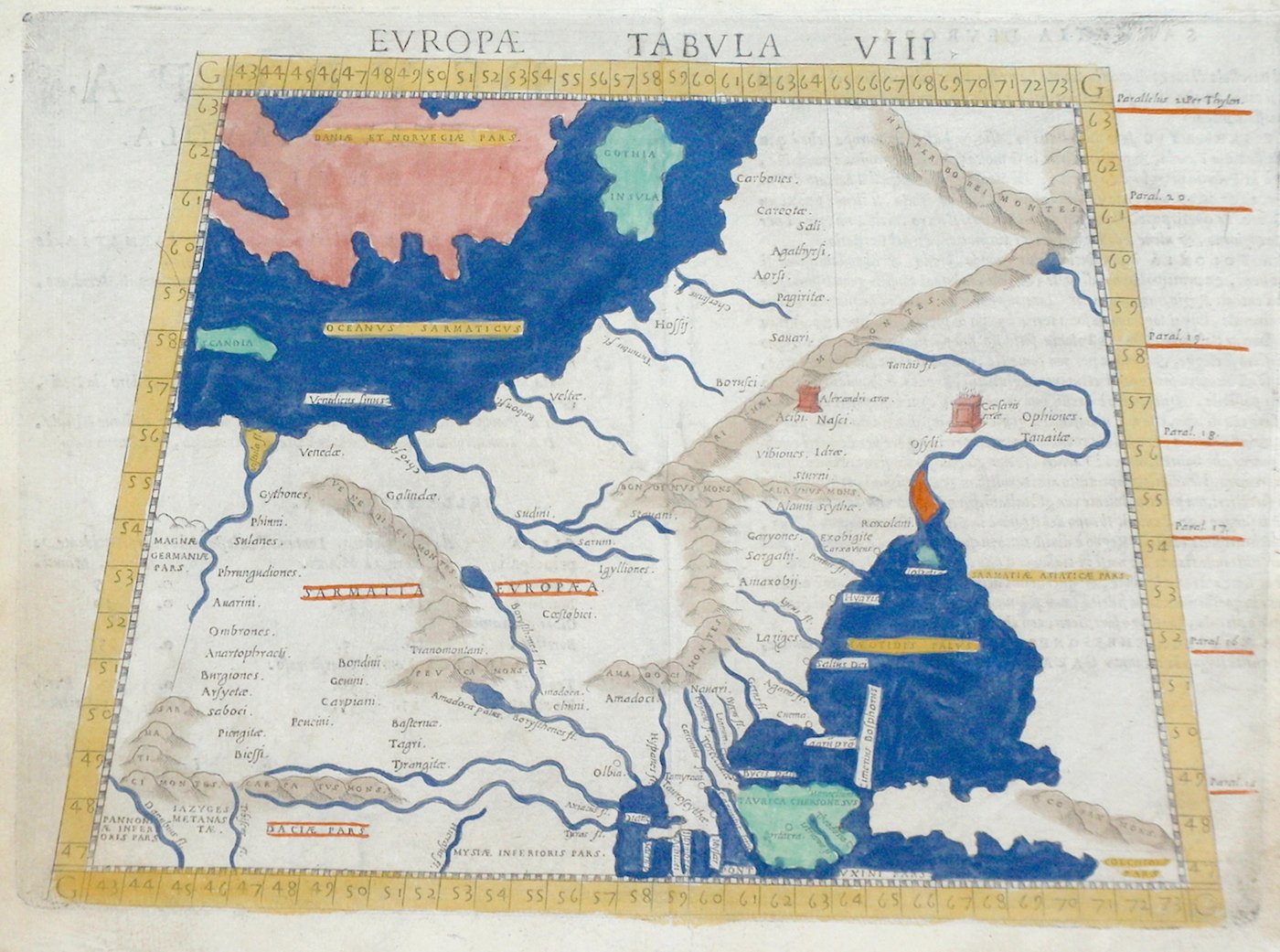Incisione in rame, colorata a mano, di mm 190x263, tratta dall'edizione veneziana della "Geographia" curata da Ruscelli. Raffigura l'europa orientale. Buon esemplare, con piccolo foro nella parte superiore della piega centrale, lievissimi aloni marginali.