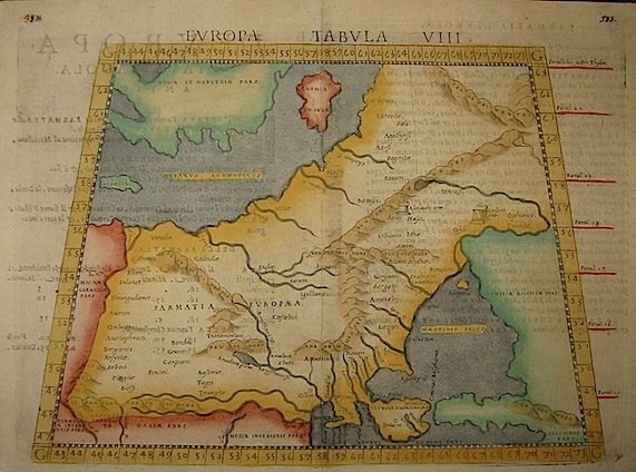 Incisione originale su rame (cm. 26x19 più margini) tratta da ‘La Geografia di Claudio Tolomeo’. Bella coloritura all’acquarello. Ottimo esemplare.