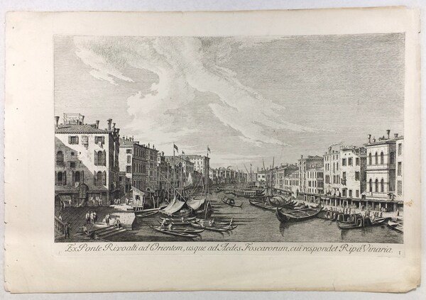 Incisione all'acquaforte di mm 432 x 270 (alla battuta). Vergatina veneziana settecentesca. Pieni margini. Filigrana Giglio Fiorentino entro Scudo Coronato. II Stato IV Tiratura Pasquali. In basso al centro "Ex Ponte Rivoalti ad Orientem, usque ad Aedes Foscarorum, cui respondet Ripa Vinaria" e sulla destra "I" in numero romano. Ottimo foglio a forte contrasto. Incisione tratta dal più che celebre album inciso da Antonio Visentini dai disegni di Canaletto "Urbis Venetiarum Prospectus Celebriores, ex Antonii Canal Tabulis XXXVIII. Aere expressi ab Antonio Visentini. In partes tres distributi". Succi "Le Prospettive di Venezia dipinte da Canaletto e incise da Antonio Visentini": "L'incisione corrisponde al dipinto del Musée Jacquemart-André, Parigi. Il punto di vista è analogo a quello di un'acquaforte di Marieschi. Il foglio di Visentini fu copiato da Brustolon in formato ingrandito…". Antonio Visentini (Venezia 1688-1782) fu pittore, incisore e architetto. Il suo nome si lega strettamente a quello di Canaletto, con il quale collaborò, nella produzione della sua opera più famosa, appunto le 38 vedute in prospettiva. Come Canaletto lavorò quasi sempre sotto il patrocinio di Joseph Smith e della casa editrice di Giambattista Pasquali: per quest'editore disegnò ed incise anche il logo con la figura di Minerva "Litterarum Felicitas"; con lo stesso collaborò alla elaborazione della Istoria d'Italia del Guicciardini, realizzando le magnifiche testatine rappresentanti le Isole della Laguna di Venezia ed i capilettera rappresentanti vedute di Campi veneziani. Per Zatta invece incise gli spaccati del magnifico volume relativo alla Basilica Marciana "L'Augusta Ducale Basilica…". Come pittore realizzò in collaborazione con Zuccarelli due paesaggi di fantasia e affrescò una serie di prospettive architettoniche per la Villa Valmarana di Vicenza, animate da macchiette di Giandomenico Tiepolo. Come architetto costruì per lo Smith la nuova facciatadel Palazzo Mangilli ai Santi Apostoli a Venezia e il Palazzetto Giusti alla Ca' d'Oro. Fu professore di prospettiva all'Accademia di Venezia, occupando la cattedra precedentemente tenuta da Gianfranco Costa. Moschini "Dell'Incisione in Venezia" - Pallucchini "Mostra degli Incisori Veneti del 700" - Morazzoni "Il libro illustrato veneziano del 700" - Succi "Prospettive di Venezia" e " Da Carlevaijs a Tiepolo" - Montecuccoli degli Erri "Canaletto incisore".