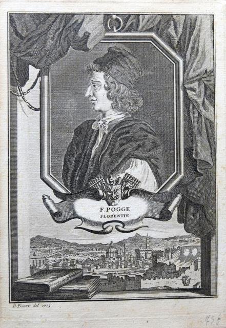 1773. Incisione in rame all'acquaforte, b/n, cm 15,3 x 21,5 (alla lastra). Ritratto a mezzo busto di Gian Francesco Poggio Bracciolini , in francese detto “Pogge Florentin”, e, in calce, piccola veduta di Firenze. Rifilata in prossimità della battuta della lastra ma buono l'inciso.