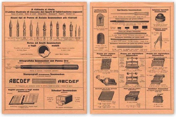 F. Soennecken. Stabilimenti per la fabbricazione delle penne di acciaio, registratori, articoli per cancelleria e mobili da ufficio di classe. Rappresentanze generale esclusivo per l'italia F. Bontadi Riassunto prospettivo dei principali articoli. s.d. (anni '20).