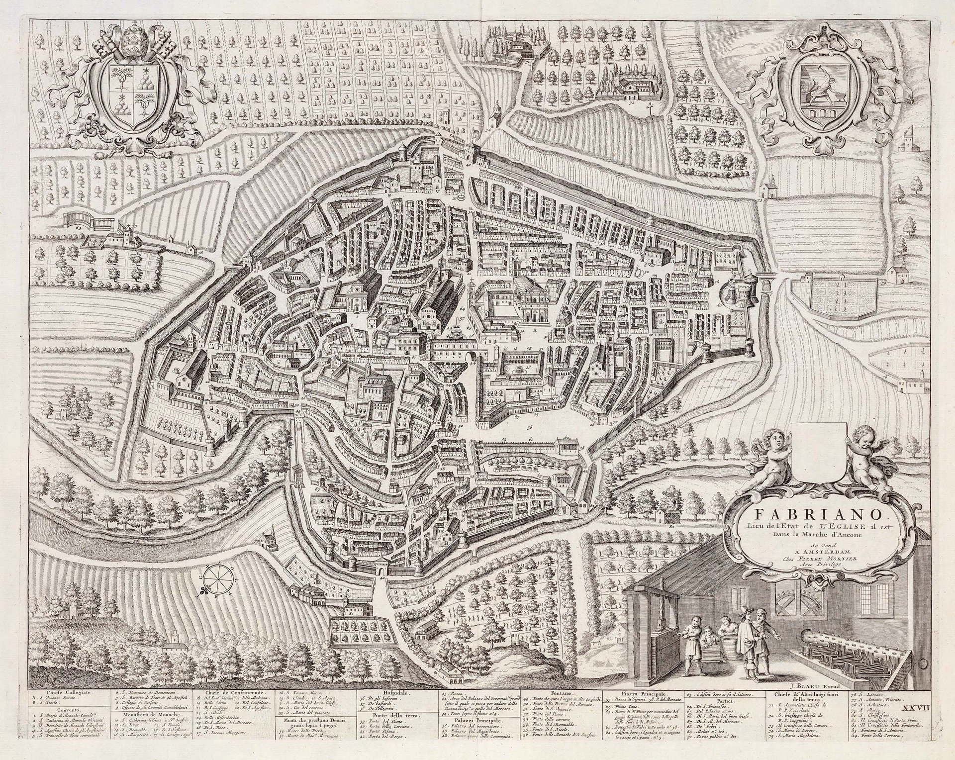 Incisione in rame, mm 445x540; foglio mm540x 620. Titolo e dati tipografici entro ricco cartiglio figurato in basso a destra, che illustra una cartiera. Nel margine inferiore legenda con toponomastica dei luoghi. In alto Pianta prospettica della città marchigiana, tratta da "Nouveau théâtre d'Italie" di Pierre Mortier (1661-1711) editore assai attivo ad Amsterdam agli inizi del XVIII secolo: tra le sue principali fatiche si annovera la ristampa del "Theatrum Civitatum…Italiae" di Blaeu con l'aggiunta originale di un quarto volume, relativo a nord Italia e Toscana. Allo stesso modo, Alberts apportò modifiche e inserì la sua impronta su molte mappe. Bell'esemplare, tracce usuali di piega editoriale al centro, marginoso. Tavola proveniente dall'opera Nouveau Theatre d'Italie, ou Description exacte de ses Villes, Palais, Eglises. opera edita per la prima volta ad Amsterdam nel 1704. CREMONINI 55, n. 136.<BR>