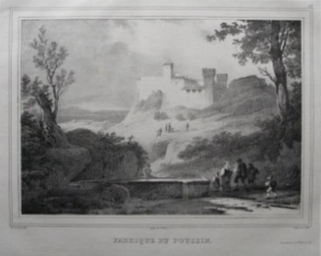 Lith. de Villain, 1840 circa. Litografia, b/n, cm 30,2 x 24,3 (la parte figurata) più margini. Delineata dal Michallon e litografata dal Villeneuve, piacevole scena animata da figure in costume che avanzano in uno scorcio roccioso (presso Gragnano?). Buono stato.