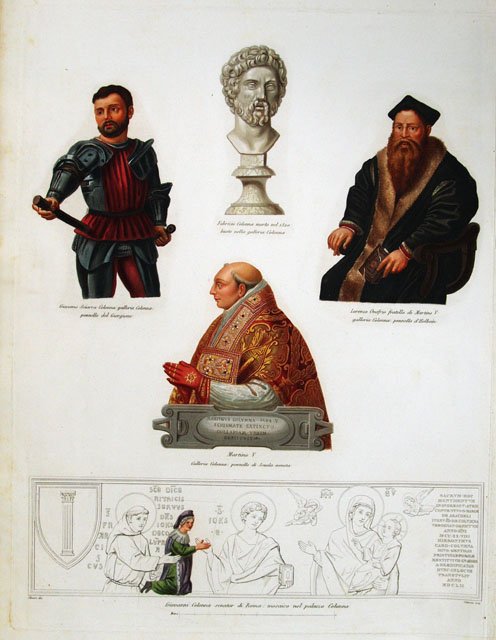 Tavola raffigurante i ritratti miniati di Giacomo Sciarra Colonna, Martino Colonna (Papa V), Lorenzo Onofrio (fratello di Martino) e di Giovanni Colonna. Busto in color seppia di Fabrizio Colonna