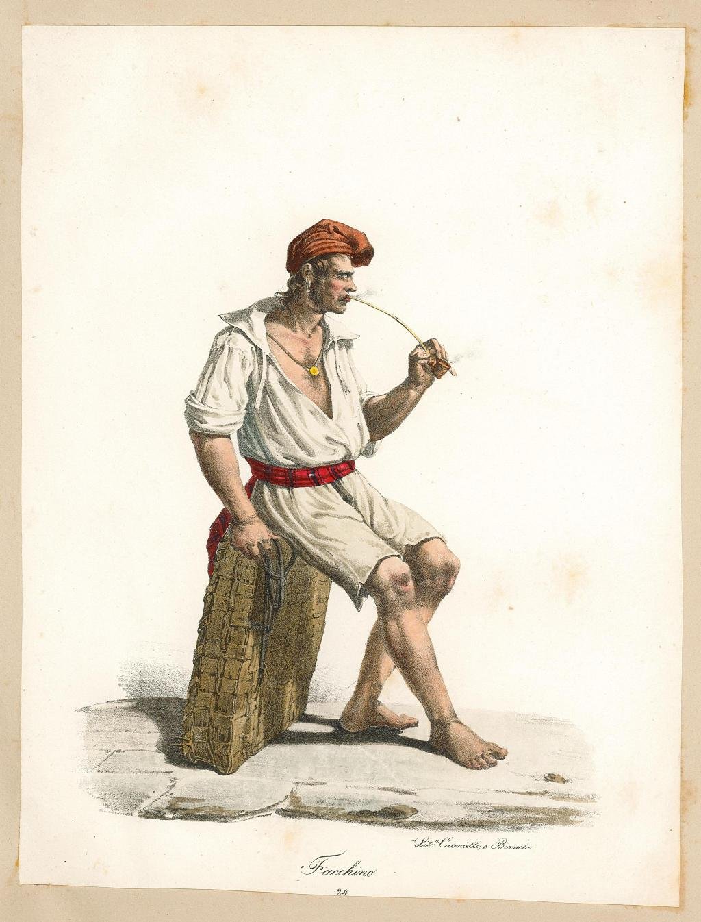 Litografia, antica originale, in bella coloritura coeva, raffigurante un facchino. L'incisione è ridimensionata al margine ed applicata all'epoca su di un supporto cartaceo coevo