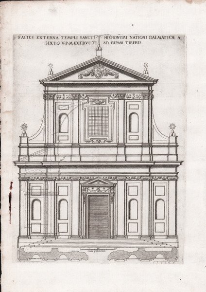 Facciata della Chiesa di San Girolamo degli Illirici. In alto l'iscrizione in latino: "Facies Externa Templi Sancti Hieronymi Nationi Dalmaticae a Sixto V.P.M. Extructi ad Ripam Tiberis". Acquaforte, stampata su carta vergata coeva, buone condizioni. Poco si sa di Regnard, se non che fu un incisore francese che trascorse gran parte della sua vita lavorativa a Roma realizzando belle incisioni dei magnifici edifici e delle antichità. Quest'opera di Regnard fu pubblicata a Roma da Francois Collignon nel 1650, senza titolo, ma in un insieme noto come ' Praecipua urbis templa. Le tavole mostrano prospetti, sezioni e piante di chiese romane del XVI e XVII secolo, con didascalie che le identificano e i loro architetti (con occasionali attribuzioni errate). Includono lavori di Carlo Maderno, G. della Porta, F. da Volterra, la famiglia Longhi, G.B. Soria e molti altri. Rara. Chiesa di San Girolamo degli Illirici. Above the inscription in Latin: "Facies Externa Templi Sancti Hieronymi Nationi Dalmaticae a Sixto V.P.M. Extructi ad Ripam Tiberis". Etching, printed on contemporary laid paper, good condition. Little is known about Regnard, except that he was a French engraver who spent much of his working life in Rome making fine engravings of the magnificent buildings and antiquities. This work by Regnard was published in Rome by Francois Collignon in 1650, without a title, but in a set known as ' Praecipua urbis templa. The plates show elevations, sections and plans of 16th- and 17th-century Roman churches, with captions identifying them and their architects (with occasional misattributions). They include work by Carlo Maderno, G. della Porta, F. da Volterra, the Longhi family, G.B. Soria and many others. Rare. Cfr.