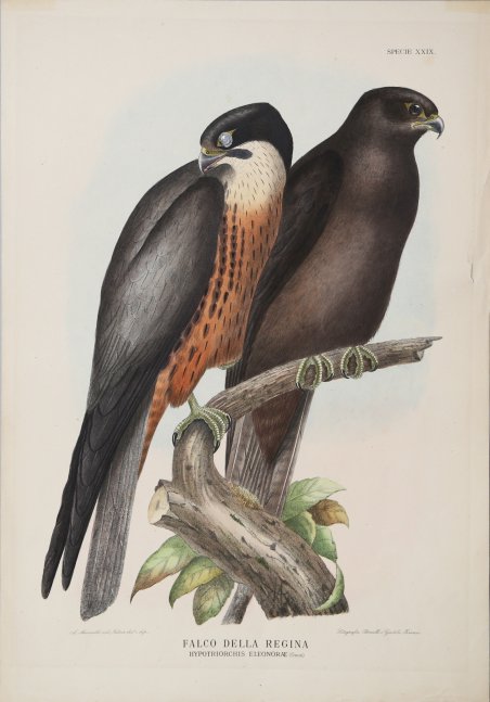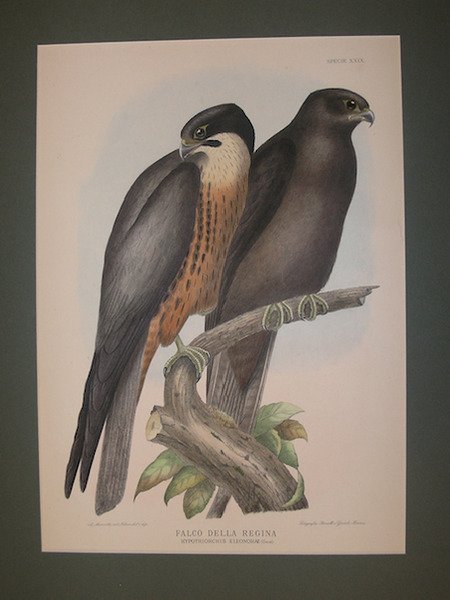 Litografia a colori, finemente acquarellata in epoca, tratta dalla rara ' Iconografia dell'avifauna italica, ovvero, Tavole illustranti le specie di uccelli che trovansi in Italia: con brevi descrizioni e note / testo del dott. Enrico Hillyer Giglioli; tavole di Alberto Manzella, ' edita a Prato prima e a Firenze poi tra il 1878 ed il 1882. ' Nel 1876 Enrico Hillyer Giglioli, professore di zoologia e anatomia comparata, pubblica, presso il Museo di storia Naturale di Firenze, ' la Collezione Centrale degli Animali Vertebrati Italiani, raccolta che ha fortemente influenzato la sua produzione scientifica. In particolare, la sezione ornitologica è stata oggetto di numerosi e importanti lavori che documentano l’immagine che gli studiosi avevano di queste specie alle soglie del Novecento.Giglioli inizia a lavorare sull’Iconografia della Avifauna Italica ' nel 1879, un ambizioso ma incompiuto programma editoriale che si poneva come scopo la rappresentazione dal vero di tutte le specie di uccelli della fauna italiana. L’opera doveva essere pubblicata in circa ottanta fascicoli mensili di cui hanno visto la luce cinquantaquattro, ognuno corredato di cinque litografie, ricavate dalle tavole, disegnate e colorate a mano da Alberto Manzella. ' In ottimo stato di conservazione. Color lithograph, finish by hand, taken from the rare ' Iconografia dell'avifauna italica, ovvero, Tavole illustranti le specie di uccelli che trovansi in Italia: con brevi descrizioni e note / testo del dott. ' Enrico Hillyer Giglioli; tavole di Alberto Manzella, ' edited in Prato first and in Florence then between 1878 and 1882.In 1876 Enrico Hillyer Giglioli, professor of zoology and comparative anatomy, published, at the Museum of Natural History of Florence, ' la Collezione Centrale degli Animali Vertebrati Italiani ' (Central Collection of Italian Vertebrate Animals), a collection that strongly influenced his scientific production. In particular, the ornithological section has been the subject of numerous and important works, which document the image that scholars had of these species on the threshold of the twentieth century.Giglioli began work on the ' Iconography of the Italian birdlife ' in 1879, an ambitious but unfinished editorial program that had as its purpose the live representation of all species of birds of the Italian fauna. The work was to be published in about eighty monthly issues, of which fifty-four actually saw the light, and each issue was accompanied by five lithographs, obtained from the plates drawn, and colored by hand by Alberto Manzella.In excellent condition. Cfr.