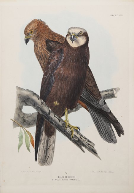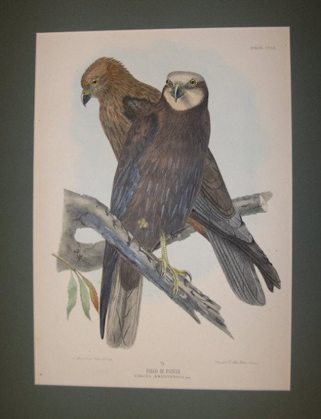 Litografia a colori, finemente acquarellata in epoca, tratta dalla rara ' Iconografia dell'avifauna italica, ovvero, Tavole illustranti le specie di uccelli che trovansi in Italia: con brevi descrizioni e note / testo del dott. Enrico Hillyer Giglioli; tavole di Alberto Manzella, ' edita a Prato prima e a Firenze poi tra il 1878 ed il 1882. ' Nel 1876 Enrico Hillyer Giglioli, professore di zoologia e anatomia comparata, pubblica, presso il Museo di storia Naturale di Firenze, ' la Collezione Centrale degli Animali Vertebrati Italiani, raccolta che ha fortemente influenzato la sua produzione scientifica. In particolare, la sezione ornitologica è stata oggetto di numerosi e importanti lavori che documentano l’immagine che gli studiosi avevano di queste specie alle soglie del Novecento.Giglioli inizia a lavorare sull’Iconografia della Avifauna Italica ' nel 1879, un ambizioso ma incompiuto programma editoriale che si poneva come scopo la rappresentazione dal vero di tutte le specie di uccelli della fauna italiana. L’opera doveva essere pubblicata in circa ottanta fascicoli mensili di cui hanno visto la luce cinquantaquattro, ognuno corredato di cinque litografie, ricavate dalle tavole, disegnate e colorate a mano da Alberto Manzella. ' In ottimo stato di conservazione. Color lithograph, finish by hand, taken from the rare ' Iconografia dell'avifauna italica, ovvero, Tavole illustranti le specie di uccelli che trovansi in Italia: con brevi descrizioni e note / testo del dott. ' Enrico Hillyer Giglioli; tavole di Alberto Manzella, ' edited in Prato first and in Florence then between 1878 and 1882.In 1876 Enrico Hillyer Giglioli, professor of zoology and comparative anatomy, published, at the Museum of Natural History of Florence, ' la Collezione Centrale degli Animali Vertebrati Italiani ' (Central Collection of Italian Vertebrate Animals), a collection that strongly influenced his scientific production. In particular, the ornithological section has been the subject of numerous and important works, which document the image that scholars had of these species on the threshold of the twentieth century.Giglioli began work on the ' Iconography of the Italian birdlife ' in 1879, an ambitious but unfinished editorial program that had as its purpose the live representation of all species of birds of the Italian fauna. The work was to be published in about eighty monthly issues, of which fifty-four actually saw the light, and each issue was accompanied by five lithographs, obtained from the plates drawn, and colored by hand by Alberto Manzella.In excellent condition. Cfr.