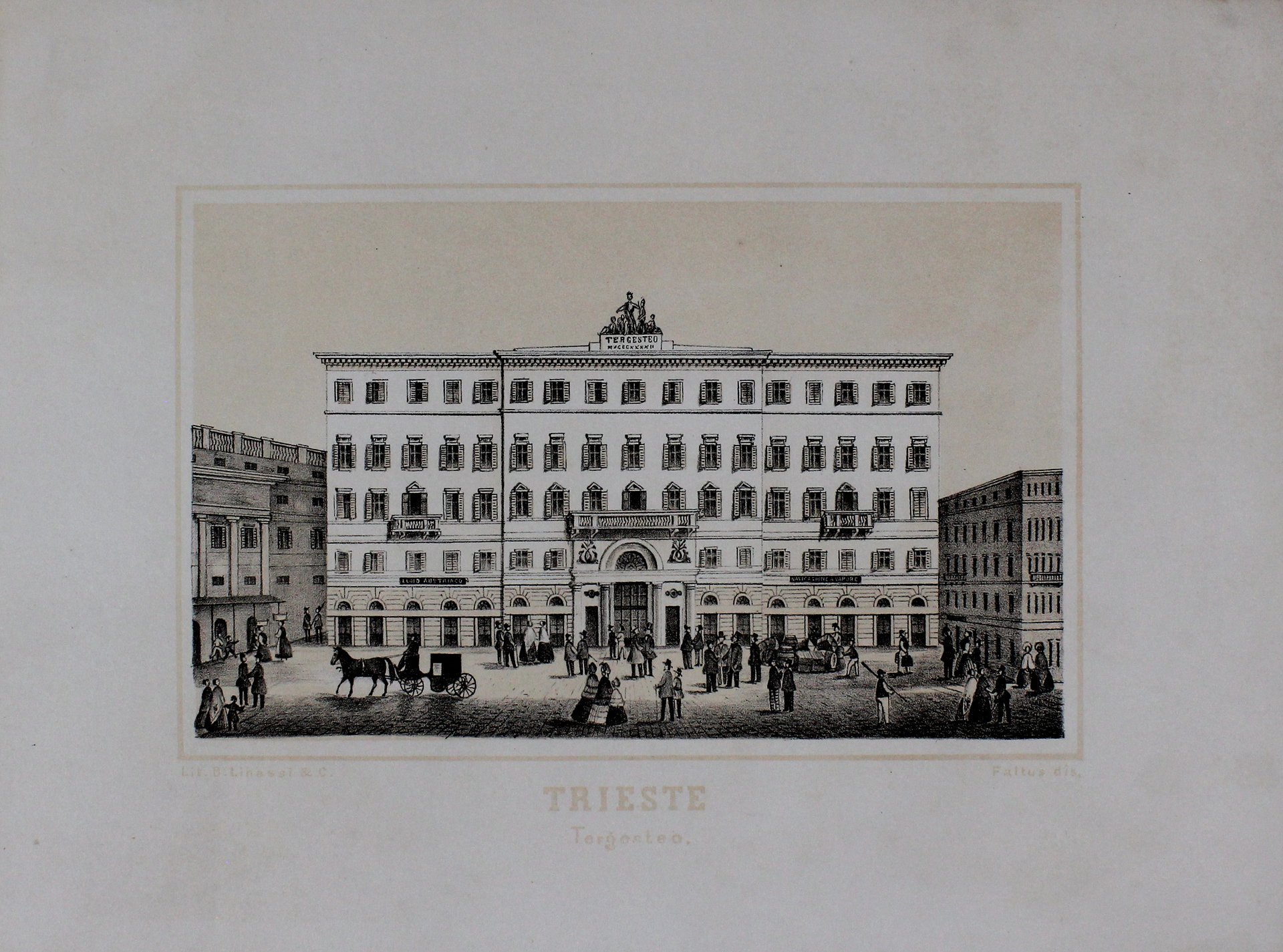 Veduta del Palazzo del Tergesteo in Piazza della Borsa litografata da Bartolomeo Linassi da disegno di Francesco de Faltus.