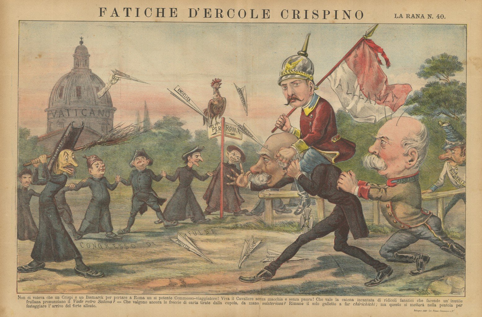 Litografia, antica ed originale, stampata a colori, tratta dal ricercato e raro giornale umoristico settimanale LA RANA, fondato a Bologna nel novembre 1865 da Leonida Gioannetti e da Augusto Grossi. Fu un giornale di grande successo per le sue satiriche caricature a colori di cui alcune in qudruplo foglio che fu uno dei successi editoriali. I politici, lo Stato Ecclesiastico e la politica europea furono i prediletti ispiratori. Il periodico affrontò una grave crisi nel 1873, quando Grossi decise di abbandonare la redazione per fondare Il Papagallo. La Rana sospese le pubblicazioni nel 1911, per cessarle definitivamente nel 1912. Restauri da piccoli strappi