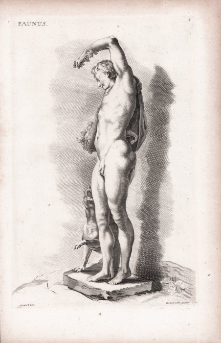 Opera tratta dalla celebre ' Academia Todesca della Architectura, Scultura & Pittura: oder Teutsche Academie der Edlen Bau, Bild-und Mahlerey-Künste, raccolta monumentale, riccamente illustrata da centinaia di incisioni raffiguranti antichità, architettura e mitologia classica, edita a Norimberga e Francoforte tra il 1675 ed il 1680. ' Per le incisioni, il Sandrart si avvalse dei suoi collaboratori Karl Gustav von Amling (1650-1703); Philip Kilian (1628-1693); Richard Collin (1627-97); Georg Andreas Wolfgang (1631-1716); Johann Georg Waldreich (d.1680); Melchior Küsel (1626-1683); Franck, Johann (fl.1659-1690); George Christoph Eimmart (1638-1705); Susanna Maria von Sandrart (1658-1716); Bartholomäus Kilian (1630-1696). L'opera è piena di illustrazioni di edifici romani antichi e moderni, scultura, teoria della pittura, biografie di artisti, tra cui artisti tedeschi e contemporanei (cioè del XVII secolo), e antichità. Joachim von Sandrart fu un pittore di una certa importanza, ma è per la sua Teutsche Academie che è principalmente ricordato. Il suo compendioso trattato include sezioni sulla scultura antica e l'architettura, la prospettiva, la teoria della pittura, biografie di artisti, una traduzione delle Metamorfosi di Ovidio e così via. La seconda parte del Libro I pretende di dare una storia dell'arte dalle sue prime origini, e si apre con un'incisione di due scene di racconti leggendari della scoperta del disegno. L'opera è dedicata alla nazione tedesca di fama mondiale e ai campioni e amanti dell'arte ('Der Welt-berühmten Teutschen Nation . Kunst-Helden und Kunstliebenden'). Acquaforte, con margini, ottimo stato di conservazione. Bibliografia National Gallery (Washington), ' Mark J. Millard, III (1998), no. 111; F.W. H. Hollstein, ' German engravings . ca. 1400-1700 ' (1954-), 38-41; Anna Schreurs, ' Unter Minerva schutz: bildung durch kunst in Joachim von Sandrarts 'Teutscher Academie' ' (2012). Plate taken fom the monumental ' Academia Todesca della Architectura, Scultura & Pittura: oder Teutsche Academie der Edlen Bau, Bild-und Mahlerey-Künste ' (Deutsche Academy of Architecture - Sculpture – Painting). ' The first edition, in German, was published by Joachim von Sandrart in Nuremberg, in three volumes respectively in 1675, 1679 and 1680. For the plates Sandrart used his students as and many others artist as Karl Gustav von Amling (1650-1703); Philip Kilian (1628-1693); Richard Collin (1627-97); Georg Andreas Wolfgang (1631-1716); Johann Georg Waldreich (d.1680); Melchior Küsel (1626-1683); Franck, Johann (fl.1659-1690); George Christoph Eimmart (1638-1705); Susanna Maria von Sandrart (1658-1716); Bartholomäus Kilian (1630-1696). The work is full of illustrations of ancient and modern Roman buildings, sculpture, the theory of painting, biographies of artists, including German and contemporary (ie seventeenth-century) artists, and antiquities. Joachim von Sandrart was a painter of some note but it is for his Teutsche Academie that he is chiefly remembered. His compendious treatise includes sections on ancient sculpture and architecture, perspective, the theory of painting, artists’ biographies, a translation of Ovid’s Metamorphoses and so on. The second part of Book I purports to give a history of art from its earliest origins, and opens with an engraving of two scenes of legendary accounts of the discovery of drawing. ' The frontispiece to Volume I is signed as drawn by J. de Sandrart and engraved by C.G. Amling; that of Volume II is signed as drawn by Sandrart and engraved by R. Collin. The portrait in Volume I is signed as painted by J.U. Mair and engraved by P. Kilian; that in Volume II is signed as engraved by R. Collin. Many plates are signed as drawn by Sandrart and engraved by R. Collin or other engravers (J. Franck, G.A. Wolfgang, J.G. Waldreich, I.I. Thourneyser, Melchior Küsell, G. C. Eimmart, B. Kilian, Jacob Sandrart, Joh. Meyer, Susanna von Sandrart, J.A. Boener, C. Meyer). Many plates are unsigned. The work is dedicated to the world-renowned German nation and to champions and lovers of art ('Der Welt-berühmten Teutschen Nation . Kunst-Helden und Kunstliebenden'). Etching with margins, very good condition. References National Gallery (Washington), ' Mark J. Millard, III (1998), no. 111; F.W. H. Hollstein, ' German engravings . ca. 1400-1700 ' (1954-), 38-41; Anna Schreurs, ' Unter Minerva schutz: bildung durch kunst in Joachim von Sandrarts 'Teutscher Academie' ' (2012). Cfr.