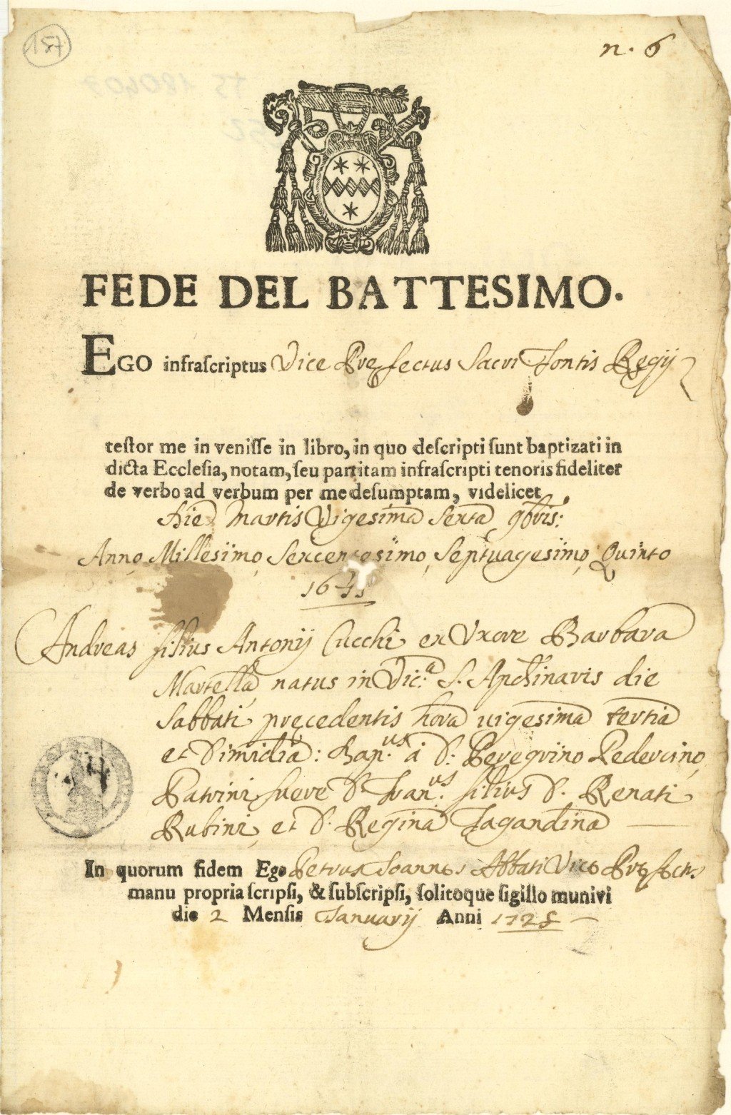 Documento, antico ed originale proveniente da importante collezione reggiana. Parte manoscritta con inchiostro bruno " .Andreas filius Antoij Cucchi e Uxore Barbara Marzella.