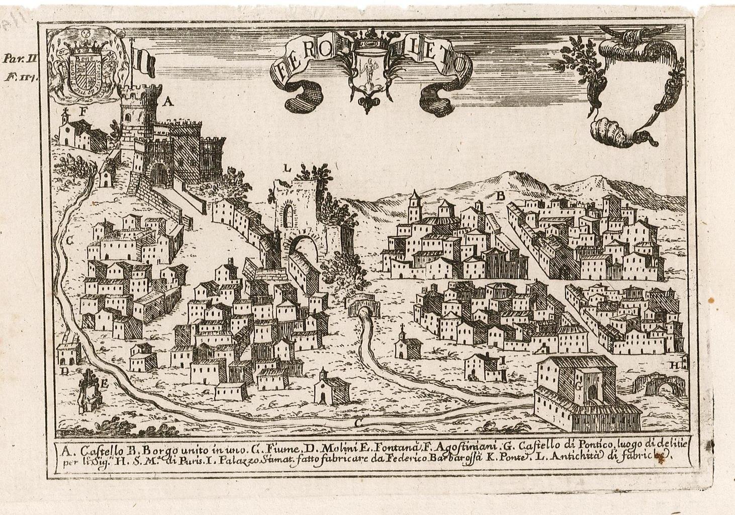 Stampa, antica ed originale, con veduta prospettica della cittadina, in calce rimandi da A a L. Autore: Pacichelli Gio. Battista. Luogo: Feroleto - Calabria. Anno: 1703. Tecnica: incisione in rame. Dimensioni: 125x180. Tratta dalla rara opera "Il Regno di Napoli / in prospettiva / diviso in dodeci provincie." pubblicata a Napoli da Michele L. Mutio nel 1703. Incisione stampata con inchiostro bruno.