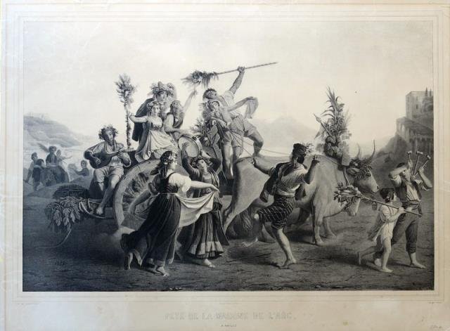 Paris, Lemercier, 1850 circa. Litografia in b/n, cm 50 x 67 (il foglio). Da un dipinto di Robert Leopold e con litografia di Lafosse, bella e folcloristica scena di costume con i festeggiamenti della Madonna dell'Arco in Napoli. Stampata su carta applicata su sottile cartoncino, un lieve ingiallimento, in ampi margini e in buono stato.