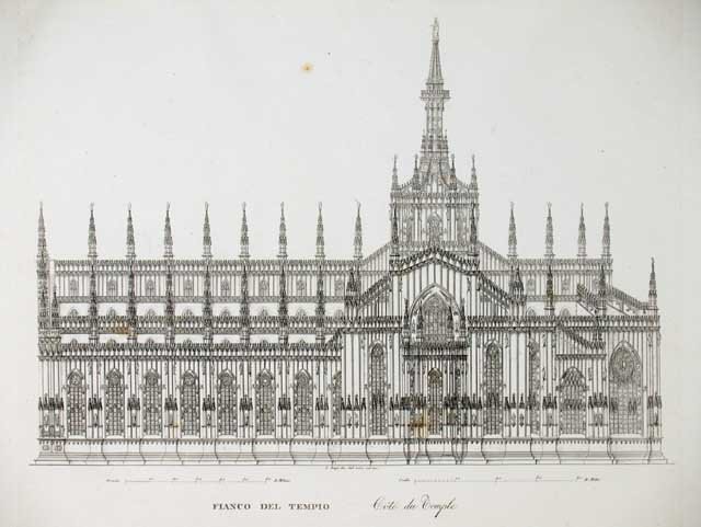 Raffigurazione del fianco del duomo, il titolo si ripete in francese