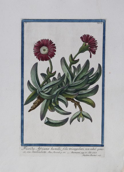 Tavola botanica tratta dal monumentale Hortus Romanus Juxta Systema Tournefortianum Paulo Strictius Distributus A Georgio Bonelli Monregalensi In Subalpinis, Publico Medicinae Professore: Specierum Nomina Suppeditante, Praestantiorum, Quas Ipse Selegit, Adumbrationem Dirigente Liberato Sabbati Maevaniensi In Umbria Chirurgicae Professore, Et Horti Custode; Adjectis Unicuique Volumini Rariorum Plantarum Tabulis C. Aere Incisis. Tom. I. (- Tom. VII.) L’opera viene stampata a Roma durante l’arco di ben 22 anni e da diversi editori: a spese di Bouchard e Gravier: Paolo Giunchi, 1772-1780-Tipografia Salomoni, 1784-Giovanni Zempel, 1793. Prima edizione di questa monumentale opera di botanica, sicuramente la più vasta e riccamente illustrata tra quelle prodotte in Italia fino ad allora. Intorno al 1770 gli editori francesi Bouchard e Gravier, avendo intenzione di dare alle stampe un catalogo illustrato dell’Orto botanico di Roma, ne proposero la direzione al medico piemontese Giorgio Bonelli (1724-1782), allora docente presso l’università romana. La cura della preparazione dei campioni per l’apparato iconografico fu invece affidata a Liberato Sabbati (1714-1778), un farmacista umbro, che era allora custode dell’Orto medesimo. Il primo volume uscì nel 1772 con una ricca introduzione del Bonelli, in cui questi fornisce un resoconto dei più recenti sviluppi della botanica e dei nuovi sistemi di classificazione e adduce poi i motivi della sua preferenza per il sistema elaborato da Joseph Pitton de Tournefort, a suo avviso più semplice e adatto all’apprendimento. Per ragioni ignote Bonelli abbandonò tuttavia l’impresa. Nel 1774, a partire dal secondo volume, essa fu presa in mano e poi condotta a termine da Niccolò Martelli (1735-1829), docente di botanica della Sapienza. Questi dette all’opera un’impostazione più linneana, pur continuando ad avvalersi della collaborazione di Liberato Sabbati fino alla sua morte, che avvenne nel 1778 al termine della pubblicazione dei primi cinque volumi. Il suo posto fu quindi preso dal figlio Costantino Sabbati. L’Hortus romanus contiene la classificazione delle varie specie di piante ospitate nell’Orto Botanico di Roma, che, stando a quanto affermato nella Horti Romani brevis historia che apre il primo volume, fu fondato a metà del Quattrocento sotto il pontificato di Niccolò V. In realtà i primi orti botanici italiani furono quelli creati a Padova e a Pisa intorno al 1545. L’Orto Romano sorse poco tempo dopo e, ampliatosi più volte, nel 1660 fu trasferito dalla sede vaticana al Gianicolo, dove ancora oggi si trova. La maggior parte delle tavole numerate non sono firmate, ma alcune sono firmate come incise da Magdalena Bouchard Il primo volume è dedicato dagli editori, Joannes Bouchard et Joannes Josephus Gravier, al Papa Clemente XIV; il secondo, al Cardinale Bernis; il terzo, al Cardinale Zelada; il quarto, al Cardinale Giraud. Il sesto volume è dedicato - dall'autore, Nicolaus Martelli - al cardinale Boncompagni. Acquaforte, finemente colorata a mano in epoca, in perfetto stato di conservazione. Bibliografia K. Nissen, ' Die botanische Buchillustration, 2 v. & suppl. (1951-1966); Great Flower Books p. 51. Hunt 629. Cleveland Botanical 509. Dunthorne 45. Pritzel 976. Nissen, BBI 200. Stafleu & Cowan TL2 634. ' Botanical plate from the Hortus Romanus Juxta Systema Tournefortianum Paulo Strictius Distributus A Georgio Bonelli Monregalensi In Subalpinis, Publico Medicinae Professore: Specierum Nomina Suppeditante, Praestantiorum, Quas Ipse Selegit, Adumbrationem Dirigente Liberato Sabbati Maevaniensi In Umbria Chirurgicae Professore, Et Horti Custode; Adjectis Unicuique Volumini Rariorum Plantarum Tabulis C. Aere Incisis. Tom. I. (- Tom. VII.) The work was printed in Rome over a period of 22 years and by different publishers: at the expense of Bouchard and Gravier: Paolo Giunchi, 1772-1780-Tipografia Salomoni, 1784-Giovanni Zempel, 1793. First edition of this monumental work of botany, certainly the most extensive and richly illustrated among those produced in Italy until then. Around 1770, the French editors Bouchard and Gravier, having the intention of printing an illustrated catalog of the Botanical Garden of Rome, proposed the direction to the Piedmontese doctor Giorgio Bonelli (1724-1782), then a professor at the University of Rome. The care of the preparation of samples for the iconographic apparatus was instead entrusted to Liberato Sabbati (1714-1778), an Umbrian pharmacist, who was then custodian of the Garden itself. The first volume was published in 1772 with a rich introduction by Bonelli, in which he gives an account of the most recent developments in botany and new systems of classification and then gives the reasons for his preference for the system developed by Joseph Pitton de Tournefort, in his opinion simpler and more suitable for learning. For unknown reasons Bonelli abandoned the enterprise. In 1774, starting with the second volume, it was taken over and then completed by Niccolò Martelli (1735-1829), professor of botany at the Sapienza. Martelli gave the work a more Linnean approach, while continuing to use the collaboration of Liberato Sabbati until his death in 1778 at the end of the publication of the first five volumes. His place was taken by his son Costantino Sabbati. The Hortus romanus contains the classification of the various species of plants housed in the Botanical Garden of Rome, which, according to what is stated in the Horti Romani brevis historia that opens the first volume, was founded in the mid-fifteenth century under the pontificate of Nicholas V. In reality, the first Italian botanical gardens were created in Padua and Pisa around 1545. The Roman Garden arose shortly thereafter and, expanded several times, in 1660 was transferred from the Vatican to the Janiculum, where it is still located today. Most of the numbered plates are unsigned, but a few are signed as engraved by Magdalena