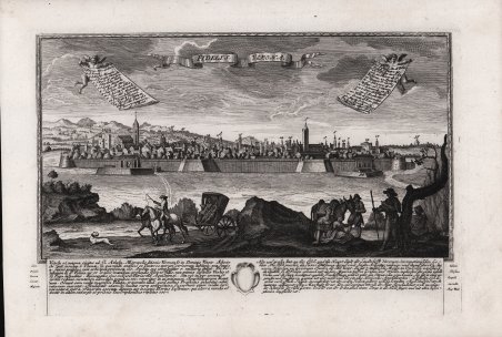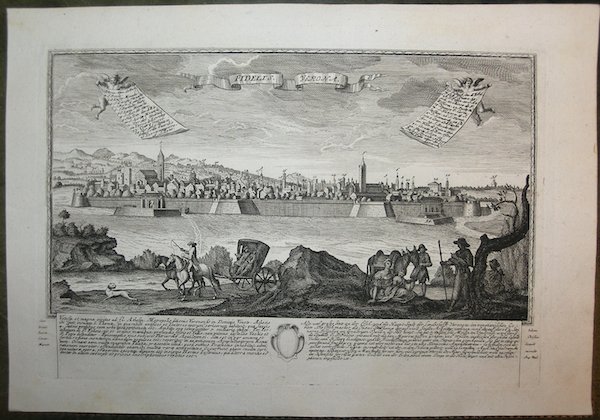 Bella e rara veduta panoramica della città delineata sulla scia della più grandi vedute disegnate da Fredrich Bernhard Werner e pubblicata ad Augsburg dagli eredi dell’editore Jeremias Wolff (1663-1724), Georg Balthasar Probst (1673-1750) – suo genero – e il suo successore, il figlio Johann Friedrich (1719-1781). Werner, nato a Reichenau, fu disegnatore, incisore, ingegnere e scenografo; durante la sua intensa vita viaggiò a lungo in vari stati europei prima in qualità di soldato poi come semplice viaggiatore, realizzando numerosi disegni dei luoghi visitati. Dopo aver trascorso un periodo di studio ad Augsburg collaborando con l’incisore K. Remshard, nel 1730 egli intraprese un viaggio in Italia, visitando molte città della penisola, per poi diventare ingegnere e scenografo del re di Prussia. La sua vasta produzione comprende una molteplicità di lavori dedicati a luoghi e città di vari paesi europei – Polonia, Olanda, Francia, Italia – soffermandosi in particolare sulla sua patria, alla quale sono dedicate le immagini della “Scenografia urbium Silesiae”, edita dagli eredi di Johann Baptist Homann a Norimberga. Werner può essere considerato uno dei più prolifici disegnatori della sua generazione, uno degli ultimi grandi personaggi che nel corso del Settecento si dedicano alla realizzazione del ritratto di città rappresentando la struttura urbana nella sua interezza, nel solco di una tradizione ormai secolare; nel corso del secolo le logiche che si affermeranno saranno invece da un lato quelle che frantumeranno la città in più immagini, dall’altro quelle che porteranno alla definitiva affermazione della topografia scientifica. Le immagini del Werner costituiscono un modello per la realizzazione di alcune altre vedute edite in Europa. Tra queste vanno ricordate quella dell’editore viennese Christofer Haffner (1668-1754), attivo probabilmente tra il 1720 e il 1750, e quelle di Johann Christian Leopold (1699-1755). Il Leopold, era un modesto incisore ed editore di Augsburg; la sua serie di vedute di città, da cui questa incisione è tratta, venne pubblicata con pochissima tiratura, rendendo quindi le opere particolarmente rare. Incisione in rame, in ottimo stato di conservazione. Beautiful and rare panoramic view of the city sketched in the wake of the greatest views drawn by Fredrich Bernhard Werner and published in Augsburg by the heirs of publisher Jeremias Wolff (1663-1724), Georg Balthasar Probst (1673-1750) - his son-in-law- and his successor, his son Johann Friedrich (1719-1781). Werner, born in Reichenau, was a draughtsman, engraver, engineer and stage designer; during his busy life he traveled extensively in various European states first as a soldier then as a simple traveler, producing numerous drawings of the places he visited. After spending a period of study in Augsburg working with engraver K. Remshard, he undertook a trip to Italy in 1730, visiting many cities on the peninsula, later becoming engineer and set designer to the King of Prussia. His vast output includes a multiplicity of works devoted to places and cities in various European countries - Poland, Holland, France, Italy - dwelling particularly on his homeland, to which the images of the "Scenografia urbium Silesiae", published by the heirs of Johann Baptist Homann in Nuremberg, are dedicated. Werner can be considered one of the most prolific draughtsmen of his generation, one of the last great figures during the eighteenth century to devote himself to the creation of the city portrait by depicting the urban structure in its entirety, in the wake of a tradition that was now centuries old; in the course of the century, the logics that would assert themselves would instead be, on the one hand, those that would break the city into several images, and on the other, those that would lead to the definitive establishment of scientific topography. Werner's images provide a model for the creation of a number of other views published in Europe. These include those of the Viennese publisher Christofer Haffner (1668-1754), active probably between 1720 and 1750, and those of Johann Christian Leopold (1699-1755). Leopold, was a modest Augsburg engraver and publisher; his series of city views, from which this engraving is taken, was published with very few print runs, thus making the works particularly rare. Copperplate engraving, in very good condition. Cfr.