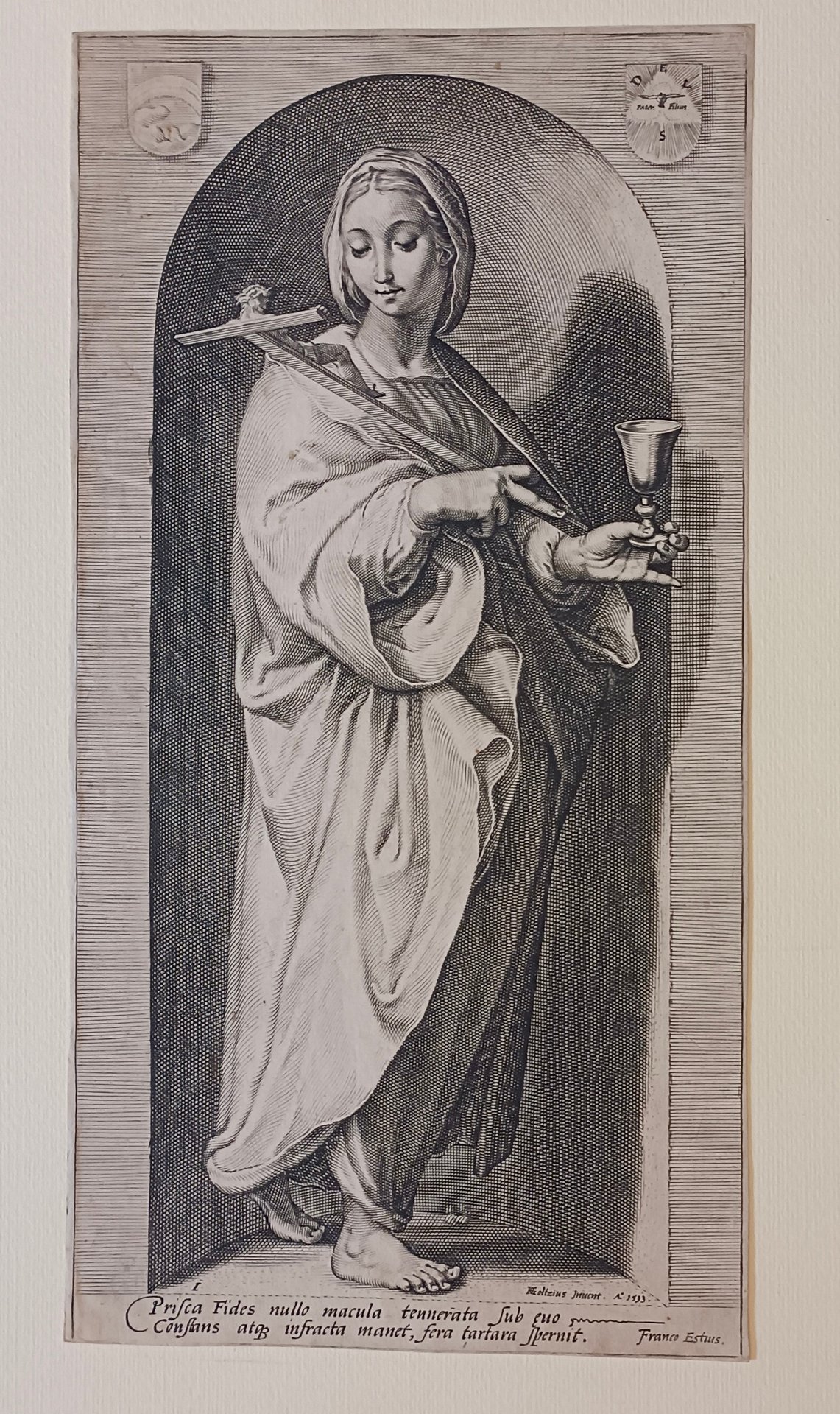 Questa stampa è la numero 1 della serie Le virtù, composta da sette tavole cinque delle quali incise da Jacob Matham e due da Jan Saenredam (Zaandam 1565 - Assendelft 1607) su disegni di Goltzius. La Fede è una giovane donna rivolta a sinistra, colta a figura intera incede verso destra all'interno di una nicchia, lo sguardo basso osserva un crocefisso. Con un tratto deciso e una fitta intersezione di linee a bulino, tipica dei modi di Goltzius, si creano forti contrasti chiaroscurali che pongono l'attenzione su determinati particolari: l'abito che scende morbido è riccamente panneggiato, il volto è sereno, levigato dalla luce, le mani dalle dita lunghe e affusolate tengono un crocifisso e un calice. Le ombre create nelle nicchia esaltano la figura e l'atmosfera argentea dona solennità alla composizione. In basso a destra "Goltzius Invent. A 1593", a sinistra il numero I, sotto la figura "Prisca Fides ... tartara spernit"/"Franco Estius".