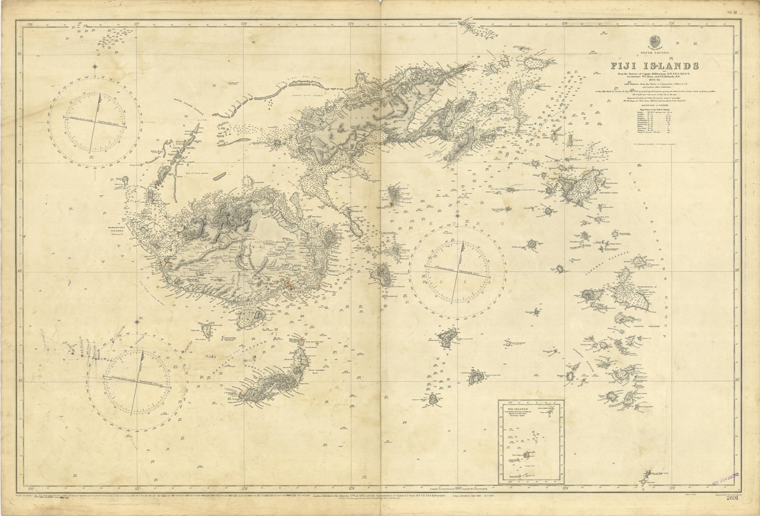 Fiji Islands From the Surveys of Captain H.M. Denham, 1854-6. Lieutenants W.U. Moore and G.E. Richards, 1876-82. with additions from the Works of Commander C. Wilkes and various other authorities. In the lower part of the chart insert of Fiji Islands Continuation of Group to Southward. London Published at the Admiralty, 17th July 1879, under the Superintendence of Captain F.J. Evans, Hydrographer. Small corrections: 1931. Folded editorially. Autore: Admiralty Charts. Luogo: Fiji Islands - Archipelago. Anno: '900. Tecnica: incisione. Dimensioni: 643x981 mm