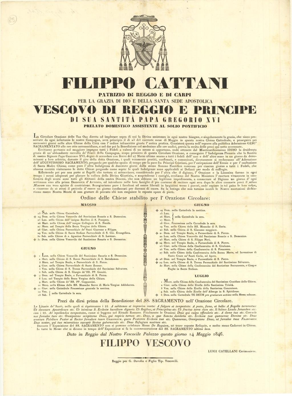 Filippo Cattani Patrizio di Reggio e di Carpi per la grazia di Dio e della Santa Sede Apostolica Vescovo di Reggio e Principe di sua Santità Papa Gregorio XVI.