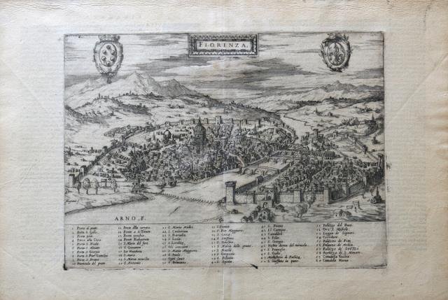 Venezia, Bolognino Zaltieri, 1569. Incisione in rame all’acquaforte, b/n, cm 21,3 x 29. Veduta a volo d’uccello della città di Firenze tratta dal “De’ disegni delle più illustri città et fortezze del mondo”, edita da Bolognino Zaltieri nel 1569, opera realizzata sulla scia de “Il Primo Libro delle Città et Fortezze Principali del Mondo” del Forlani (1567) e de “Il Civitatum Aliquot insigniorum et locorum.” del Bertelli (1568). L'opera è costituita da cinquanta vedute e da una carta geografica, e rappresenta il primo tentativo, nell'ambito dell'editoria italiana, della realizzazione di un insieme delle principali fortezze e città del mondo. A differenza dei suoi predecessori, dei quali utilizza spesso i rami e le iconografie (e quindi pur risultando il suo lavoro una ristampa delle lastre del Forlani e di Domenico Zenoi) il Ballino concepisce un'opera unitaria corredata di testo descrittivo e di indice e della quale, per la prima volta, si ha perciò la conoscenza dell'esatto numero di tavole che la compongono. In realtà la veduta di Firenze è più grande, per dimensioni, rispetto alle precedenti inserite nei lavori di Forlani e Bertelli, e quindi non risulta essere una ristampa di queste; tuttavia la correzione nel titolo (alla L di Florencia, di cui restano tracce, si sostituisce qui la I di Fiorenza) lascia supporre che si tratti comunque di una ristampa da una lastra realizzata in precedenza. In ogni caso l'incisione del Ballino è resa riconoscibile rispetto a quelle dello Zenoi e del Bertelli per la presenza del testo al verso, peraltro in un volgare già molto italianizzato. Monogrammata in lastra in basso al centro ITC. Bell'esemplare in ampi margini, in bella impressione e in ottimo stato di conservazione. (Cfr. Cremonini pp. 10, 11; Valerio, pp. 46, 47).