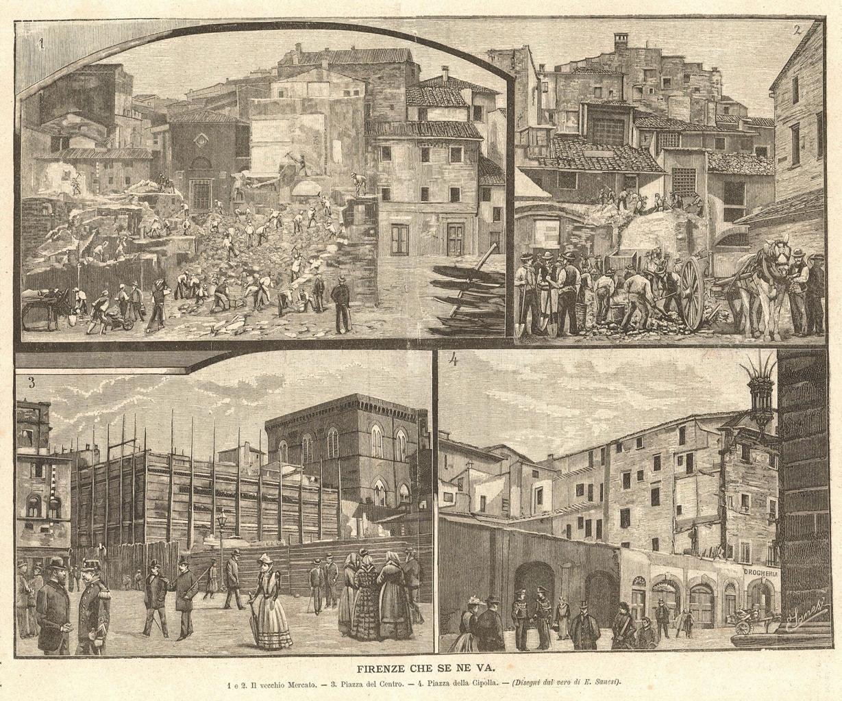 Stampa, antica ed originale, con raffigurazione dei lavori di abbattimento di alcune vecchie case, per una nuova urbanizzazione della città. Testo al verso. Autore: Sanesi E. Luogo: Firenze. Anno: 1890. Tecnica: xilografia. Dimensioni: 237x305.