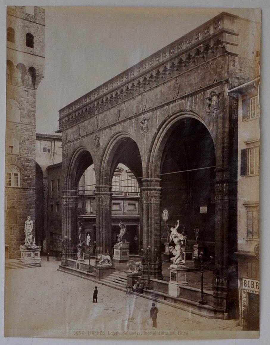 Fotografia all'albumina di mm 253 x 195. Buono stato di conservazione. In basso la dicitura "3057 Firenze Loggia de' Lanzi. Incominciata nel 1376". Lo stabilimento fotografico di Giacomo Brogi (1822-1881) venne fondato a Firenze nel 1864, e proseguì la sua attività, sotto la direzione del figlio Carlo, fino al 1950, rappresentando con le loro immagini un secolo di storia italiana.