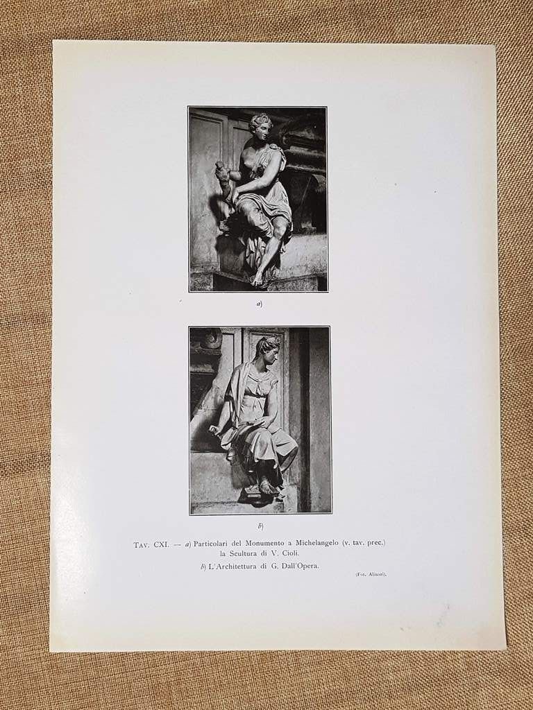 Firenze nel 1917 Monumento a Michelangelo del Vasari Particolare V.Cioli S.Croce Rara tavola estratta da pubblicazione del 1917 Stampata su carta non retroscritta Firenze nel 1917 Monumento a Michelangelo del Vasari Particolare: La scultura di V. Cioli Chiesa di Santa Croce Toscana Dimensioni: Cm 22,00 x 30,00 Codice prodotto: GEO-146
