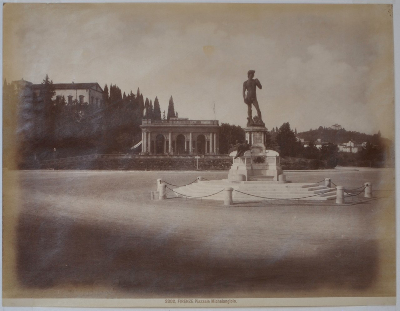 Fotografia all'albumina di mm 253 x 198. Buono stato di conservazione. In basso la dicitura "3302 Firenze. Piazzale Michelangelo". Lo stabilimento fotografico di Giacomo Brogi (1822-1881) venne fondato a Firenze nel 1864, e proseguì la sua attività, sotto la direzione del figlio Carlo, fino al 1950, rappresentando con le loro immagini un secolo di storia italiana.