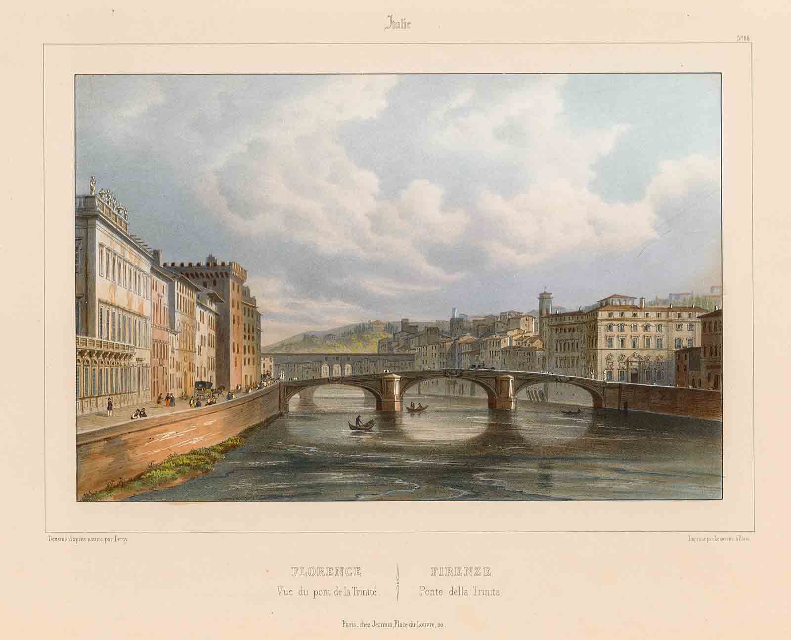 Veduta del Ponte della Trinità in Firenze. In lontananza si scorge Ponte Vecchio. L'incisione è caratterizzata da una pregevole coloritura coeva. Rara a trovarsi nello stato presente