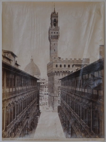 Fotografia all'albumina di mm 252 x 184. Buono stato di conservazione. In basso la dicitura "3023 Firenze. Portici degli Uffizi costruiti sul disegno di Vasari" e più a destra "Edizioni Brogi". Lo stabilimento fotografico di Giacomo Brogi (1822-1881) venne fondato a Firenze nel 1864, e proseguì la sua attività, sotto la direzione del figlio Carlo, fino al 1950, rappresentando con le loro immagini un secolo di storia italiana.