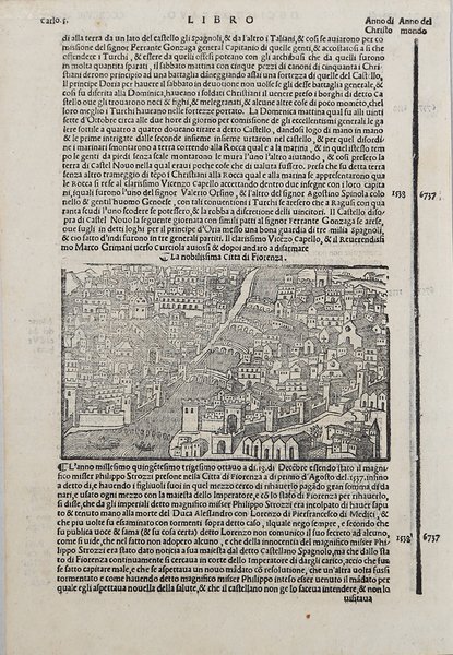 Veduta di Firenze Monte Oliveto basata sul modello introdotto da Francesco Rosselli verso la fine del XV secolo., la cosiddetta ' Veduta della Catena. ' Pagina contenente la veduta della città tratta dal ' Supplementum chronicarum orbis ab initio mundi.Giacomo Filippo di Bergamo (1434-1520), della famiglia Foresti, fu eremita agostiniano ed autore anche del ' Confessionale ' e del ' De claris mulieribus.La sua cronaca fu stampata per la prima volta nel 1483 a Venezia e successivamente aggiornata più volte; complessivamente sono conosciute sei edizioni incunabolo e sei stampate nel ‘500, di cui l’ultima nel 1553. La prima edizione in italiano è stampata a Venezia nel 1535, e da questa è tratta questa pagina. “La cosiddetta ' Veduta della Catena, è la prima rappresentazione conosciuta di una intera città, risultato non di una proiezione fantasiosa, ma di una costruzione che, basata sull’osservazione diretta dal vero, si avvale anche della prospettiva. Questa grande silografia, come ha dimostrato Hülsen, deriva dall’opera originale a bulino, su sei lastre di rame, attribuita a Francesco Rosselli, di cui oggi è conservato solo un frammento, raffigurante la campagna in direzione di Fiesole. La copia silografica, attribuita già da Kristeller a Luca Antonio degli Uberti è conservata presso il Gabinetto delle Stampe di Berlino. La silografia con ogni probabilità è stata realizzata nella prima decade del XVI secolo a Venezia, come indicato dal tratteggio a linee parallele nelle zone d’ombra, che si utilizza solo nella prima decade del sec. XVI. Rispetto al modello fiorentino, Lucantonio degli Uberti introduce due elementi innovativi: la figura dell’artista disegnatore, in basso a destra, e il motivo decorativo della catena, chiusa in alto a sinistra da un lucchetto – di qui la denominazione ' Veduta della Catena ' - per cui sono state fornite diverse interpretazioni. Il punto di osservazione principale è da sud-ovest, in corrispondenza del campanile della chiesa di Monte Oliveto, ed è stato rialzato per dare maggiore leggibilità alle emergenze architettoniche e al tessuto urbano. Nella veduta l’asse centrale verticale viene fatto coincidere con l’asse della cupola di Santa Maria del Fiore che, simbolo religioso e civile della città, diventa così elemento principale e punto costante di riferimento nella rappresentazione della città stessa. La veduta crea un campo spaziale continuo che non solo mostra gli edifici, ma anche gli spazi aperti, le piazze e anche il corso delle strade di recente realizzazione, e non ancora chiuse dagli edifici che saranno costruiti lungo i loro lati. I monumenti della città sono quindi disposti nella pianta in modo da riflettere le reali relazioni tra di loro. Fuori dalle mura della città, l’immagine restituisce le principali caratteristiche del paesaggio naturale: vista da sud-est, la pianta mostra la città delimitata a nord dalla parete naturale degli Appenini; la valle del Mugnone, attraverso la quale passa la strada che collega la città a Bologna, crea una spettacolare apertura tra le montagne nell’angolo superiore a sinistra. Fiesole e S. Domenico sono rappresentate con un gruppo di edifici sormontati dal toponimo. Il convento di S. Miniato e di S. Francesco segnano le vette che dominano la città da sud. L’Arno attraversa diagonalmente l’immagine tagliando la città in due parti. Dunque, la rappresentazione del paesaggio non è né evocativo né poetico. Questa rappresentazione senza soluzione di continuità tra la città, fulcro dell’immagine, e il paesaggio, risponde sia alla realtà politica, in quanto i territori rappresentati appartengono di fatto allo Stato fiorentino, sia ad un’ambizione pittorica: sia la città che il paesaggio circostante sono concepiti come uno spazio topografico unitario. La veduta riporta il titolo ' FIORENZA, variante poetica del toponimo che, come sottolinea David Friedman, fa allusione ai concetti di “fiore” e di “fio. View of Florence from Monte Oliveto, based on the model introduced by Francesco Rosselli in the late 15th century, the so called ' Veduta della Catena ' (view with the chain). ' From the ' Supplementum chronicarum orbis ab initio mundi.Giacomo Filippo di Bergamo (1434-1520), of the Foresti family, was an Augustin hermit and author of Confessionale and De claris mulieribus. His works have been published for the fist time in Venice in 1483.The first Italian edition, from which the present example is taken, was published in 1535. “La cosiddetta ' Veduta della Catena, è la prima rappresentazione conosciuta di una intera città, risultato non di una proiezione fantasiosa, ma di una costruzione che, basata sull’osservazione diretta dal vero, si avvale anche della prospettiva. Questa grande silografia, come ha dimostrato Hülsen, deriva dall’opera originale a bulino, su sei lastre di rame, attribuita a Francesco Rosselli, di cui oggi è conservato solo un frammento, raffigurante la campagna in direzione di Fiesole. La copia silografica, attribuita già da Kristeller a Luca Antonio degli Uberti è conservata presso il Gabinetto delle Stampe di Berlino. La silografia con ogni probabilità è stata realizzata nella prima decade del XVI secolo a Venezia, come indicato dal tratteggio a linee parallele nelle zone d’ombra, che si utilizza solo nella prima decade del sec. XVI. Rispetto al modello fiorentino, Lucantonio degli Uberti introduce due elementi innovativi: la figura dell’artista disegnatore, in basso a destra, e il motivo decorativo della catena, chiusa in alto a sinistra da un lucchetto – di qui la denominazione ' Veduta della Catena ' - per cui sono state fornite diverse interpretazioni. Il punto di osservazione principale è da sud-ovest, in corrispondenza del campanile della chiesa di Monte Oliveto, ed è stato rialzato per dare maggiore leggibilità alle emergenze architettoniche e al tessuto urbano. Nella veduta l’asse centrale verticale viene
