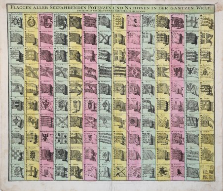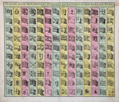 Affascinante tavola di bandiere pubblicata da Matthias Seutter circa nel 1740. La tavola presenta 139 bandiere di varie nazioni, fazioni e compagnie commerciali. Tra le bandiere più interessanti ci sono quelle della Compagnia Olandese delle Indie Occidentali (G.W.C. /Geoctroyeerde Westindische Compagnie) e della Compagnia Olandese delle Indie Orientali (V.O.C. / Vereenigde Oostindische Compagnie). Il primo posizionamento delle bandiere inglesi nel quadrante superiore sinistro suggerisce che questa carta potrebbe essere stata copiata da una fonte inglese, anche se probabilmente derivata da una carta delle bandiere olandesi pubblicata da Cornelis Danckerts intorno al 1700. La carta fu ripresa da J. B. Homann, che pubblicò una propria variante intorno al 1710. Quando Seutter lasciò la ditta Homann all'inizio del XVIII secolo, potrebbe aver portato con sé questa tavola o averla semplicemente copiata. Matthäus Seutter (1678 - 1757) fu uno dei più importanti e prolifici editori tedeschi di mappe del XVIII secolo. Attivo, come incisore sotto la tutela dell'importante J. B. Homann. All'inizio del 1700 Seutter lasciò Homann per tornare ad Augusta, dove lavorò per l'importante editore d'arte Jeremia Wolff (1663 - 1724), per il quale incise mappe e altre stampe. Intorno al 1717 fondò la propria casa editrice cartografica indipendente ad Augusta. La maggior parte delle mappe di Seutter sono pesantemente basate, se non addirittura copie, di lavori precedenti fatti dalle calcografie Homann e De L'Isle. Ciononostante, dal 1731/32 Seutter era uno degli editori più prolifici del suo tempo e fu onorato dall'imperatore tedesco Carlo VI che gli diede il titolo di Geografo Imperiale, dopo il quale la maggior parte delle mappe successive includeva la denominazione Avec Privilege. Seutter continuò a pubblicare fino alla sua morte, all'apice della sua carriera, nel 1757. Acquaforte con coloritura editoriale, in ottimo stato di conservazione. A very attractive c. 1765 flag chart issued by Matthias Seutter. The plate features 139 flags of various nations, factions, and trading companies. Among the more interesting flags are those of the Dutch West India Company (G.W.C. /Geoctroyeerde Westindische Compagnie) and the Dutch East India Company (V.O.C. / Vereenigde Oostindische Compagnie). The premier placement of English flags in the upper left quadrant suggest that this chart may have been copied from an English source. This map is probably derived from a Dutch flag chart issued by Cornelis Danckerts c. 1700. The chart was picked up by J. B. Homann, who issued in own variant c. 1710. When Seutter left the Homann firm early in the 18th century, he may have taken this plate with him or simply copied it. Seutter issued his own variant sometime after 1737, as the chart notes his privilege, a kind of early copyright suggestive of royal patronage, at top center. Mattha?us Seutter (1678 - 1757) was one of the most important and prolific German map publishers of the 18th century. Seutter was born the son of a goldsmith but apprenticed as a brewer. Apparently uninspired by the beer business, Seutter abandoned his apprenticeship and moved to Nuremberg where he apprenticed as an engraver under the tutelage of the prominent J. B. Homann. Sometime in the early 1700s Seutter left Homann to return to Augsburg, where he worked for the prominent art publisher jeremiad Wolff (1663 - 1724), for whom he engraved maps and other prints. Most of Seutter's maps are heavily based upon, if not copies of, earlier work done by the Homann and De L'Isle firms. Nonetheless, by 1731/32 Seutter was one of the most prolific publishers of his time and was honored by the German Emperor Karl VI who gave him the title of Imperial Geographer, after which most subsequent maps included the Avec Privilege designation. Copperplate with fine original colouring, good condition. Cfr.