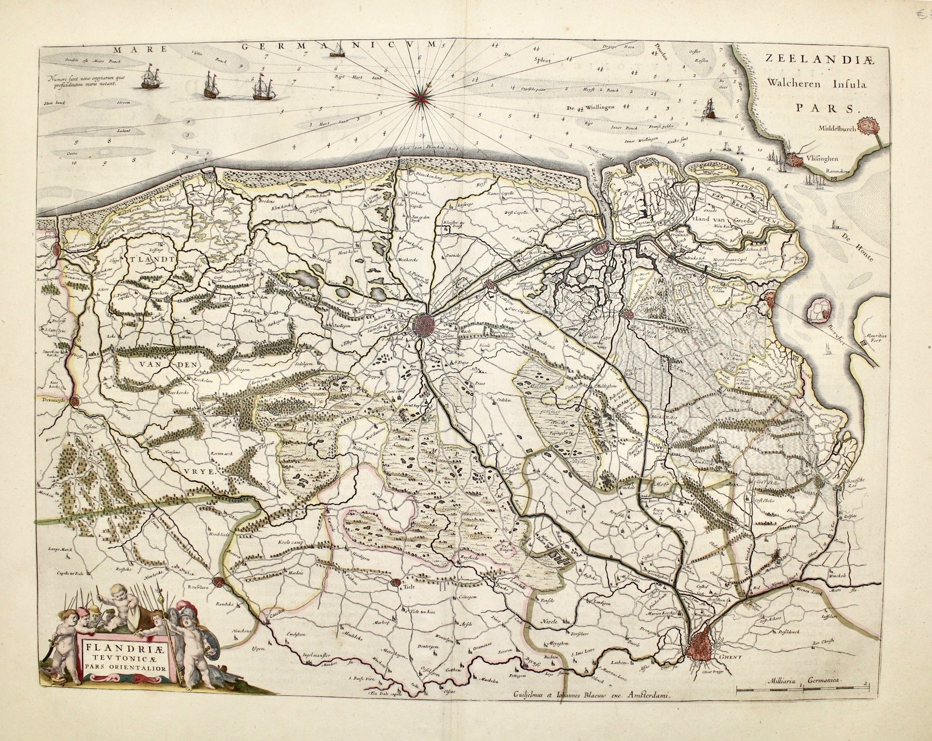 Incisione in rame, colorata d’epoca, mm 382x500, testo latino al verso. Elegante e piacevole carta delle Fiandre, raffigurante la regione di Bruges e Gand, tratta da Atlas Novus, arricchita da un bel cartiglio in basso. Ottimo esemplare. W. Blaeu, astronomo allievo di Tycho Brahe, fondò un’officina per la costruzione di globi nel 1599; quasi immediatamente iniziò a pubblicare anche carte geografiche, giungendo nel 1630 alla creazione del primo atlante “Atlantis Appendix” e cinque anni dopo, della prima edizione in due tomi del “Atlas Novus”. Dopo la sua morte nel 1638, a cura del figlio Johan si giunse nel 1662 alla pubblicazione del celebre “Atlas Maior” in 11 volumi. Nel 1672 un incendio distrusse l’officina e segnò la fine dell’attività.<BR><BR>