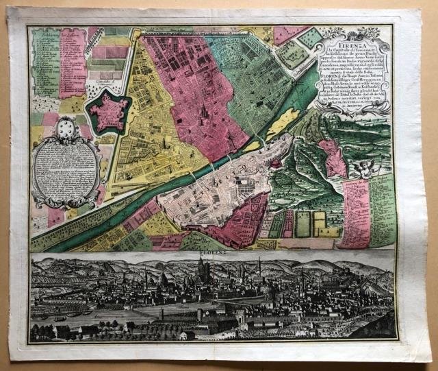 Asburgo, 1740 circa. Incisione in rame all'acquaforte, colore d'epoca, cm 40,5 x 58 (alla lastra), 50 x 58,5 circa (al foglio). Veduta planimetrica di Firenze con sottostante veduta in bianco / nero, titolo nel cartiglio in alto a destra; un secondo cartiglio è posto sulla metà del lato sinistro, sormontato dallo stemma mediceo a sei palle e contenente una lunga didascalia in italiano e in tedesco che descrive la “Residenza del Gran duca di Toscana”; legenda in alto a sinistra. A questa carta farà seguito, nel titolo e nella stesura generale, e quindi praticamente identica, quella di poco posteriore, di Tobias Conrad Lotter, stampata ad Asburgo verso il 1760. Splendida impressione e coloritura d'epoca, in margini, molto buono lo stato di conservazione.