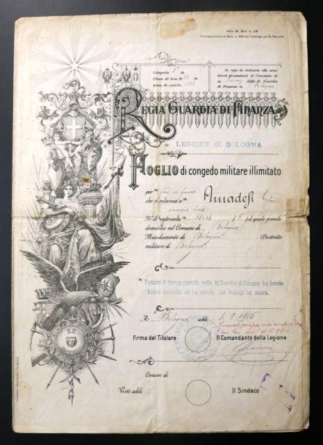 Legione di Bologna, 1 Febbraio 1915. Rilasciato a Amadelfi Cesare. Segni del tempo, discreto stato di conservazione.