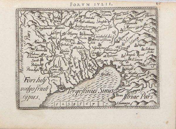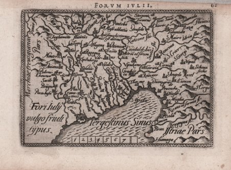 Mappa tratta dalla seconda edizione in lingua francese de ' Le Miroir du Monde. Le ' Mirour du Monde ' è l’edizione in lingua francese in prosa dello ' Spieghel der Werelt, il primo atlante tascabile pubblicato nel 1577, in lingua olandese, da Philip Galle, con testo in rima curato da Peeter Heyns, e stampato dalla tipografia Plantin. Lo ' Spieghel der Werelt ' era una versione ridotta del ' Theatrum Orbis Terrarum ' di Ortelius. Le lastre, quasi tutte derivate dal ' Theatrum, furono disegnate e incise da Philip Galle. Due anni dopo, nel 1579, fu data alle stampe l’edizione in lingua francese in prosa, perché Heyns non aveva avuto il tempo necessario per la resa in versi, col titolo ' Le Miroir du Monde. Il successo di questa edizione francese, è provato proprio dalla seconda edizione pubblicata a soli 4 anni di distanza, nel 1583. Dal 1577 al 1598, Galle & Heyns pubblicarono ben 11 edizione, di cui l’ultima – edita nell’anno della morte di Ortelius – conteneva ben 123 mappe. “È un rifacimento della tavola "FORI IV=/LII, VVL=/GO FRIV=/LI TYPVS", questa piccola stampa dal medesimo titolo che riproduciamo per prima. Essa si trova inserita ne "IL THEATRO DEL MONDO DI ABRAAMO ORTELIO: NEL QUA- LE DISTINTAMENTE SI DIMOSTRANO IN TAUOLE TUTTE LE PROUINCIE, REGNI ET PAESI DEL MONDO ecc. ridotto dalla forma gran- de in questa picciola ecc. PER PIETRO MARCHET- TI. Appresso la compagnia Bresciana, MDXCVIII”. Vi occupa la pagina 125. […] Al centro in basso, al di fuori dal riquadro cartografico, nell'originale è ripetuto il titolo con le parole "FORVM IVLII". L'orientazione non figura, ma è quella consueta. La scala è segnata, ma senza unità di misura come nella matrice orteliana. Se fosse calcolata in miglia (7 miglia = mm 32), il rapporto, secondo il Saggio marinelliano, sarebbe all'incirca di 1:4.000.000, ma alcune misurazioni sulla carta danno piuttosto un calcolo di 1:2.000.000 circa. La riduzione rispetto al modello ha imposto ovviamente uno sfoltimento negli oggetti geografici e nella nomenclatura. Così, è scomparso, per esempio, il tracciato del Corno di S. Daniele, che l'Ortelio erroneamente identifica nell'area sorgentifera dell'anfiteatro morenico del Tagliamento con l'idronimo Stella fl[uvius], e sono state eliminate tutte le scritte latine, con le sole eccezioni di quelle che accompagnano Venzone, che però figura abbreviata nella seconda parte, e Cividale. Si è aggiunto qualche errore, come quello di riunire in un solo corso d'acqua il Cellina ed il Colvera, e vi si registra qualche nuova storpiatura come S. Cergo per S. Sergo. Però Humaga è diventato correttamente Humago. La passività del rifacimento è comunque dimostrata dal fatto che non sia stata riportata la nuova fortezza di Palmanova, cui invece si fa chiaro riferimento nel testo corografico accompagnatorio, dove si legge di "vna nuoua Città & Fortezza chiamata Palma, che riesce vna delle meglio intese, & sicure Fortezze di tutta / Italia". Sono altri rifacimenti di questo medesimo filone perché presentano le stesse particolarità poco sopra segnalate, le piccole carte che si trovano inserite a pag. 940 dell "ANFITEATRO DI EUROPA, in cui si ha la descrittione del mondo celeste et elementare per quanto spetta alla cosmografia, e si segue in narrar di essa Europa il sito et confini, con le provincie, regioni et paesi, città, fortezze, et luoghi habitati, mari, monti, fiumi, et laghi, con loro nomi antichi & moderni, & insieme i costumi, habitati & nature dei popoli, et genealogia de suoi prencipi", che Giovanni Nicolò Doglioni pubblicò a Venezia, per i tipi di Sarzina, nel 1623, e al foglio 62 dell'Atlantino orteliano, di forma traversa, di Philippus Gallaeus (Antuerp. hac 26 maij, Anno MDLXXXIX. M.?.?.).“ (Lago, Rossit "Theatrum Fori Iulii" vol. 1, p.140) Incisione in rame, in ottimo stato di conservazione. ' Bibliografia: Lago, Rossit "Theatrum Fori Iulii" vol. 1, pp. 140-141, Tav. LI; G. King, Miniature An. Miniature map published taken from the second French edition of ' Le Miroir du Monde, published by Galle & Heyns in 1583, printed by Plantin and first publsihed in 1577 under the title ' Spieghel der werelt. Le ' Miror du Monde ' is the French transaltion of the Duch poems ' Spieghel der Werelt, ' the first modern pocket-atlas, published by Philip Galle with text by Peeter Heyns in 1577, based on Abraham Ortelius’ ' Theatrum Orbis Terrarum. The maps were drawn and engraved by Galle. ' Between 1577 & 1598 Galle issued 11 editions, all printed by Christopher Plantin. “È un rifacimento della tavola "FORI IV=/LII, VVL=/GO FRIV=/LI TYPVS", questa piccola stampa dal medesimo titolo che riproduciamo per prima. Essa si trova inserita ne "IL THEATRO DEL MONDO DI ABRAAMO ORTELIO: NEL QUA- LE DISTINTAMENTE SI DIMOSTRANO IN TAUOLE TUTTE LE PROUINCIE, REGNI ET PAESI DEL MONDO ecc. ridotto dalla forma gran- de in questa picciola ecc. PER PIETRO MARCHET- TI. Appresso la compagnia Bresciana, MDXCVIII”. Vi occupa la pagina 125. […] Al centro in basso, al di fuori dal riquadro cartografico, nell'originale è ripetuto il titolo con le parole "FORVM IVLII". L'orientazione non figura, ma è quella consueta. La scala è segnata, ma senza unità di misura come nella matrice orteliana. Se fosse calcolata in miglia (7 miglia = mm 32), il rapporto, secondo il Saggio marinelliano, sarebbe all'incirca di 1:4.000.000, ma alcune misurazioni sulla carta danno piuttosto un calcolo di 1:2.000.000 circa. La riduzione rispetto al modello ha imposto ovviamente uno sfoltimento negli oggetti geografici e nella nomenclatura. Così, è scomparso, per esempio, il tracciato del Corno di S. Daniele, che l'Ortelio erroneamente identifica nell'area sorgentifera dell'anfiteatro morenico del Tagliamento con l'idronimo Stella fl[uvius], e sono state eliminate tutte le scritte latine, con le sole eccezioni di quelle che accompagnano Venzone, che però figura abbreviata nella seconda parte, e Cividale. Si è aggiunto qualche 