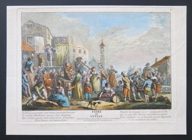 Paris, Le Bas 1800 circa. Incisione in rame all’acquaforte, colore d'epoca, cm 21 x 29 (alla battuta della lastra) più ampi margini. Piccola scena di folclore veneziano con popolani e ciarlatani. Stampata su carta forte e in ottimo stato di conservazione.